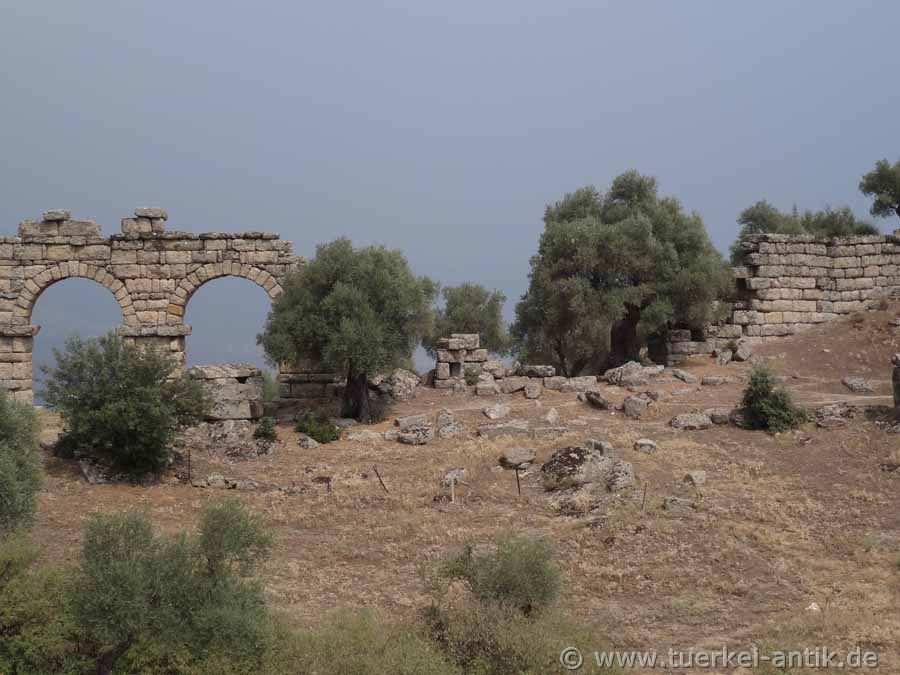 Halikarnassos als Königin von Karien ein. Auffallendstes Bauwerk ist der 90 Meter lange, vollständig erhaltene Unterbau des ehemaligen Marktgebäudes unterhalb der Agora. Die abgeteilten Kellerräume sind von der Talseite ebenerdig begehbar, das Erdgeschoss von der Agora aus. Auflager in der Außenwand und mehrere Pfeiler belegen ein früheres Obergeschoss. |