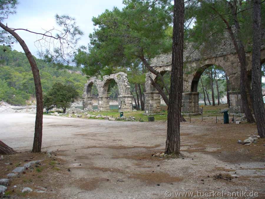 Chr. dem Lykischen Bund eingegliedert. Ihre Blütezeit hatte die Stadt in der römischen Epoche, wo sie als blühendes Handelszentrum bekannt war. Von hier aus wurden speziell Holz, Rosenöl, aber auch Parfüms und duftende Creme exportiert. Obwohl Phaselis bis in byzantinische Zeit eine Flotten- und Handelsbasis mit einigem Wohlstand war, ist der heutige Baubestand nicht sehr imposant. Die Seldschuken hatten die Stadt als Steinbruch für die Erweiterung der Befestungsanlagen Antalyas benutzt. Erhalten ist ein Theater, ein Aquädukt und eine Prachtstraße, die quer über die Halbinsel zwischen dem einstigen Galeerenhafen und dem Handelshafen verläuft. Die Akropolis der Stadt ist bis heute nicht ausgegraben. |