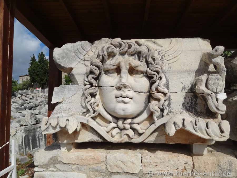 The columns stood on richly profiled bases decorated with reliefs in the front row. The crowning glory are ionic capitals of the people. The capitals of the corner columns are unique. One still shows remains of the figures of Artemis and Leto, the other (in the archaeological museum in Istanbul) shows Zeus and Apollo, each between lion grips and bull heads. |