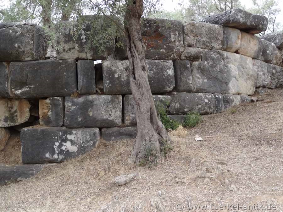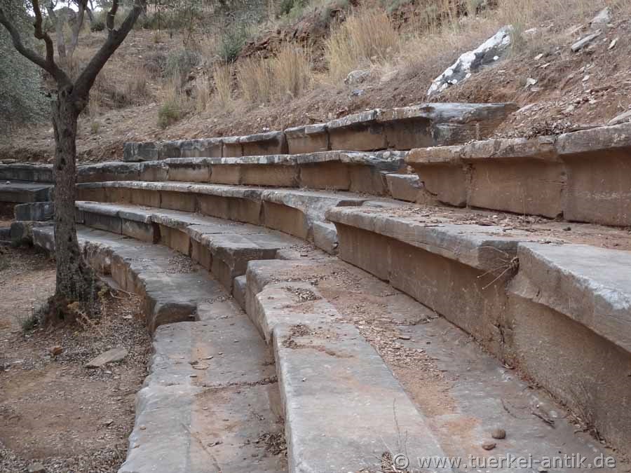 Only a few remains of the former city can be seen today. Parts of the city wall, remains of a theatre and an agora can be seen near the theatre. There are some graves in the surrounding area. The theatre hasn't been excavated yet. At present, only a few rows of seats can be seen. |
