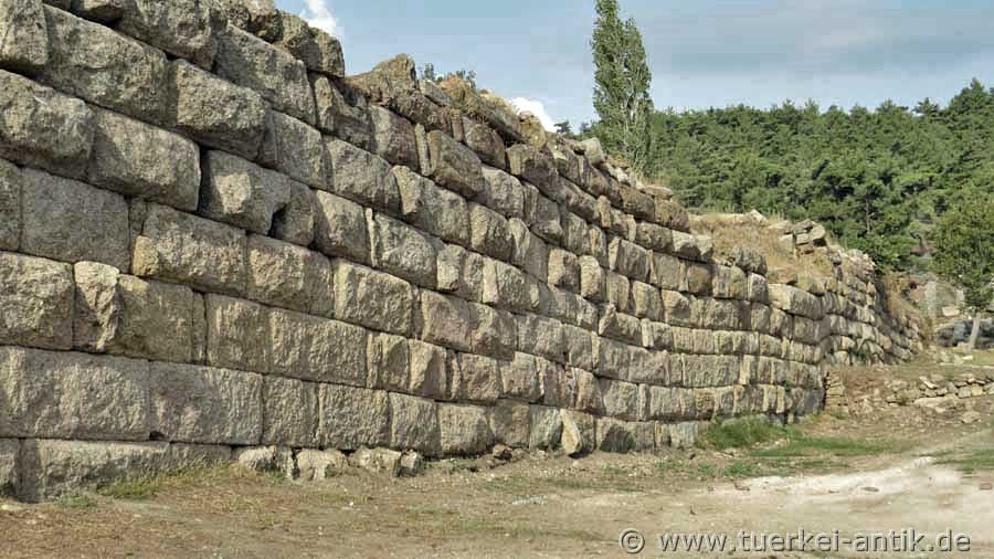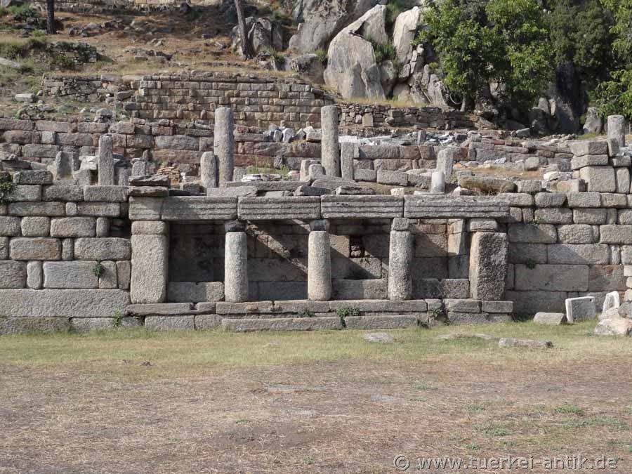 The remains of the cyclope-like masonry of the sanctuary stand about 700 metres above sea level on a platform halfway away from the valley and rise in front of a rock face split by a prehistoric lightning strike. From Mylasa an extended procession road led to the complex, which is still visible from the city today. |