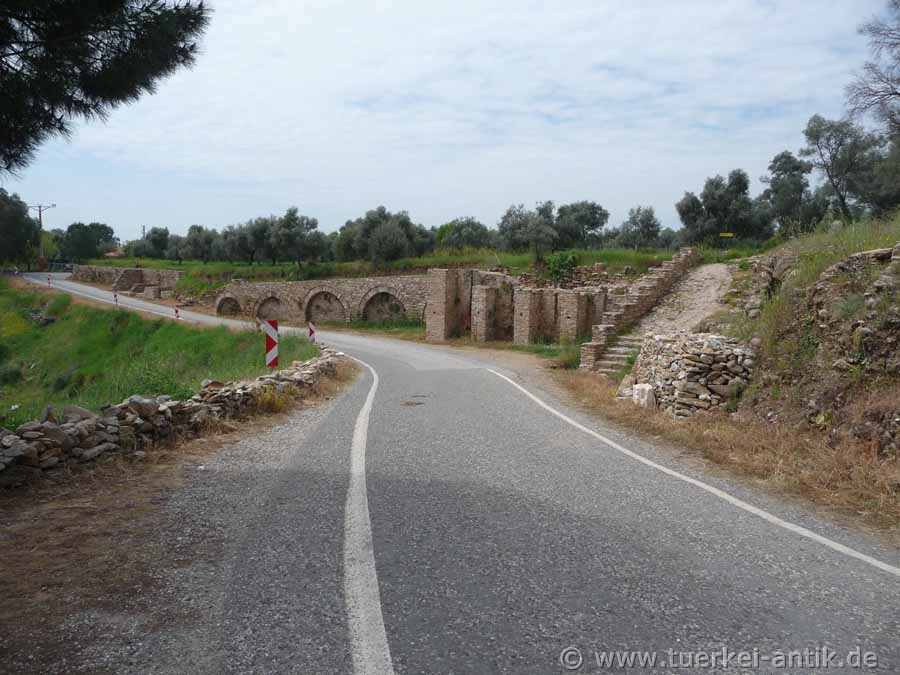 The city is divided into two parts by a stream gorge. Of archaeological remains, the bridge at Nysa is particularly noteworthy, an approximately 100-metre-long superstructure of the deep stream gorge, which served as a substructure for the theatre forecourt and is considered to be the second longest of its kind in ancient times. In front of the late Hellenistic-Roman theatre on the left side of the gorge are the still unexcavated remains of an "amphitheatre". Only a few rows of seats, mostly overgrown by grass, have survived. According to the latest findings, however, the oval ground plan is a stadium. |