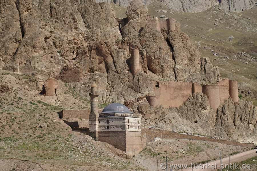 Wenige 100 Meter nördlich des Palastes in einem Seitental ist eine osmanische Kuppelmoschee aus dem 16. Jahrhundert zu sehen. Oberhalb der Moschee und jenseits der Talmulde thront in der Nähe eines urartäischen Felsgrabs die mittelalterliche Festung der Stadt auf einem steilen Felsgrat |
