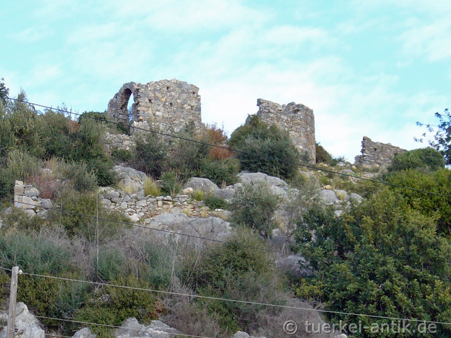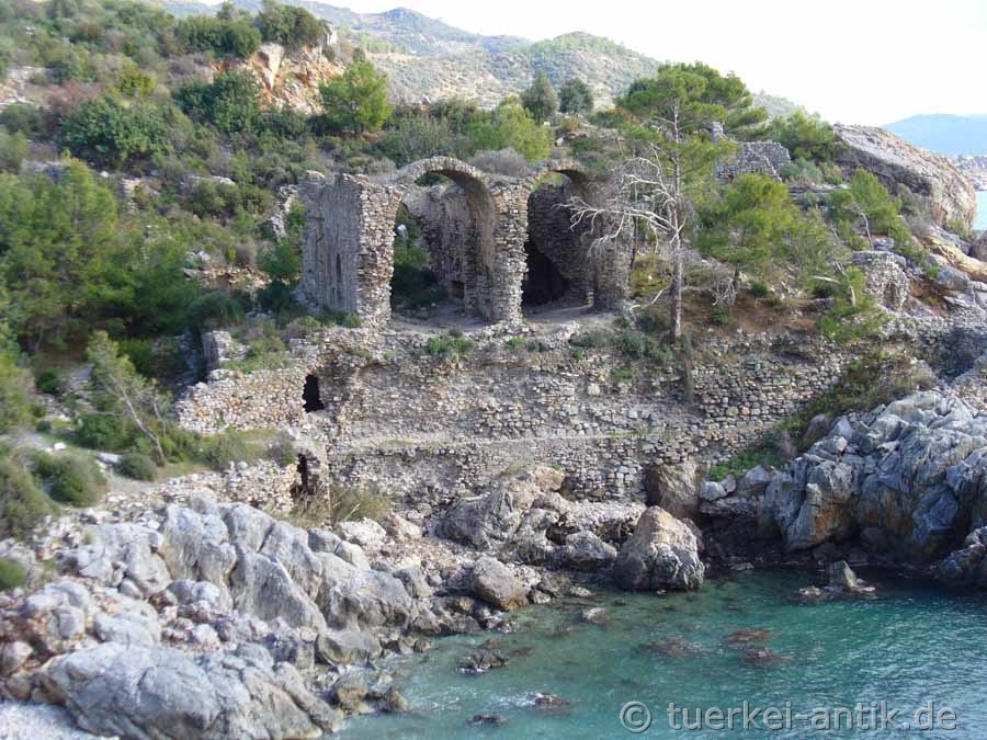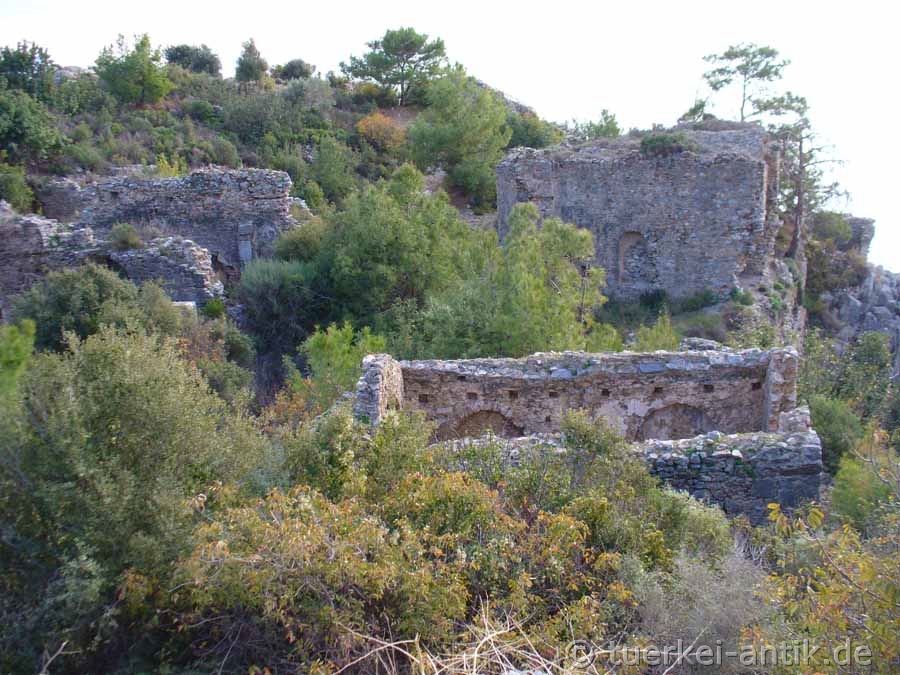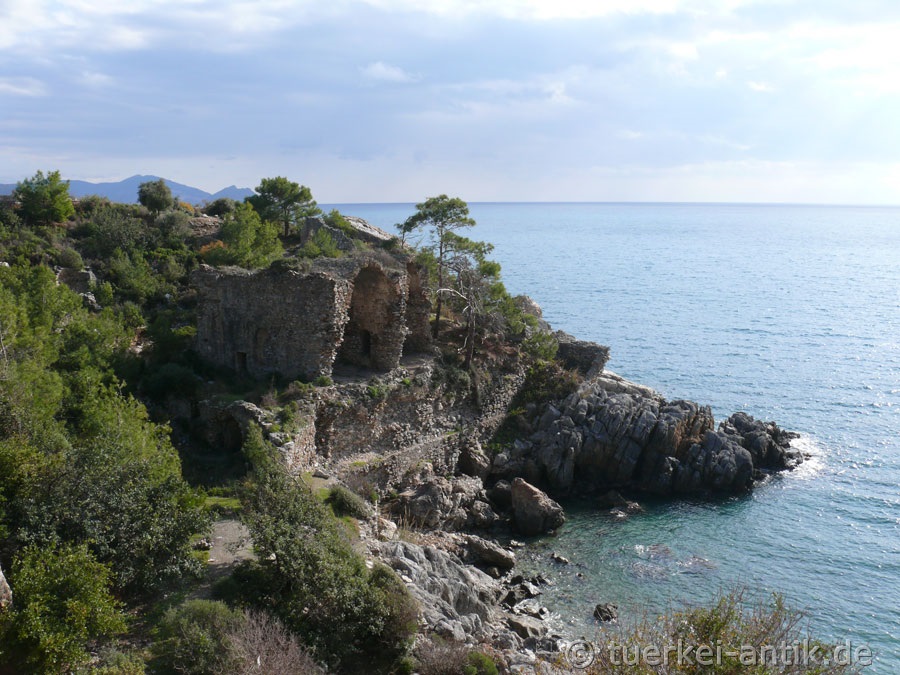 Nationalstraße D400 durchschneidet das einstige Stadtgebiet. Im vorbeifahren übersieht man fast die Mauerreste der einst wohl stolzen Stadt. Halten Sie auf der Meeresseite Ausschau nach dem gut sichtbaren Kale Restaurant, gleich danach sehen Sie die ins Meer ragende Felsnase der einstigen Akropolis. Die alte Nationalstraße D400 wurde ohne Rücksicht auf die historischen Funde durch die einstige Stadt gebaut. Das nahe am Flughafen Gazipasa vorbeiführende neue Teilstück der D400 berührt heute die Ruinen der Stadt nicht mehr. Dahingehende Befürchtungen, der Ausbau der Straße könnte noch mehr vernichten, haben sich zum Glück als nichtig erwiesen. |