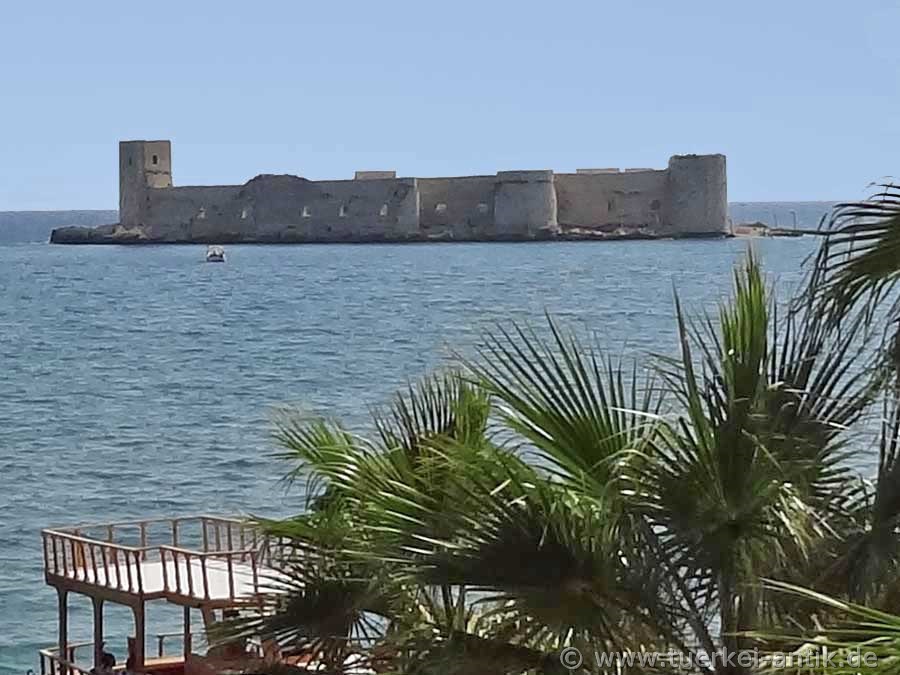 Bekannter, sicher auch weil von weit her sichtbar, ist die Seeburg, die "Mädchenburg", nach der der heutige Ort seinen Namen bekam. (Kizkalesi = türkisch Mädchenburg) Auch diese Burg diente dem Schutz des Hafens. Eine Mole verband einmal beide Burgen. Um ihre Entstehungsgeschichte rangt sich die Sage, dass ein Sultan die Burg errichten lies um seine Tochter vor einem ihr prophezeiten Schlangebiss zu schützen. Der tödliche Biss ereilte die Tochter aber trotzdem, da die Schlange in einem Obstkorb auf die Insel gebracht wurde. Diese Sage hört man in der Türkei allerdings öfter, so auch um dem Mädchenturm im Bosporus bei Istanbul. |