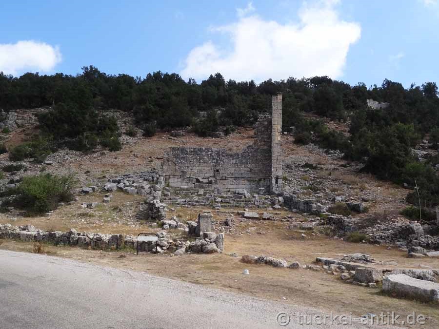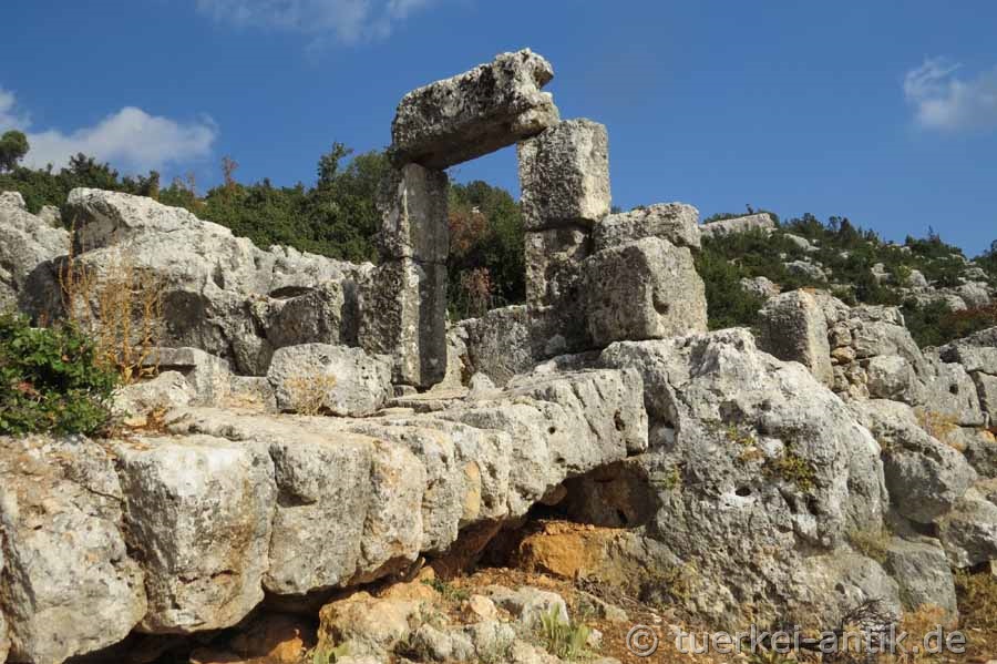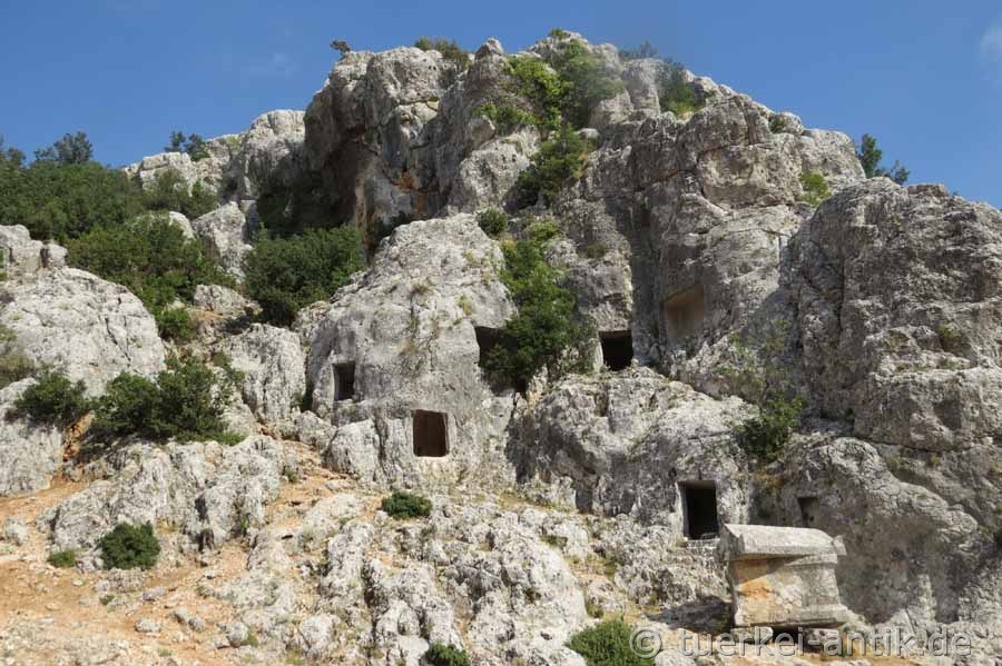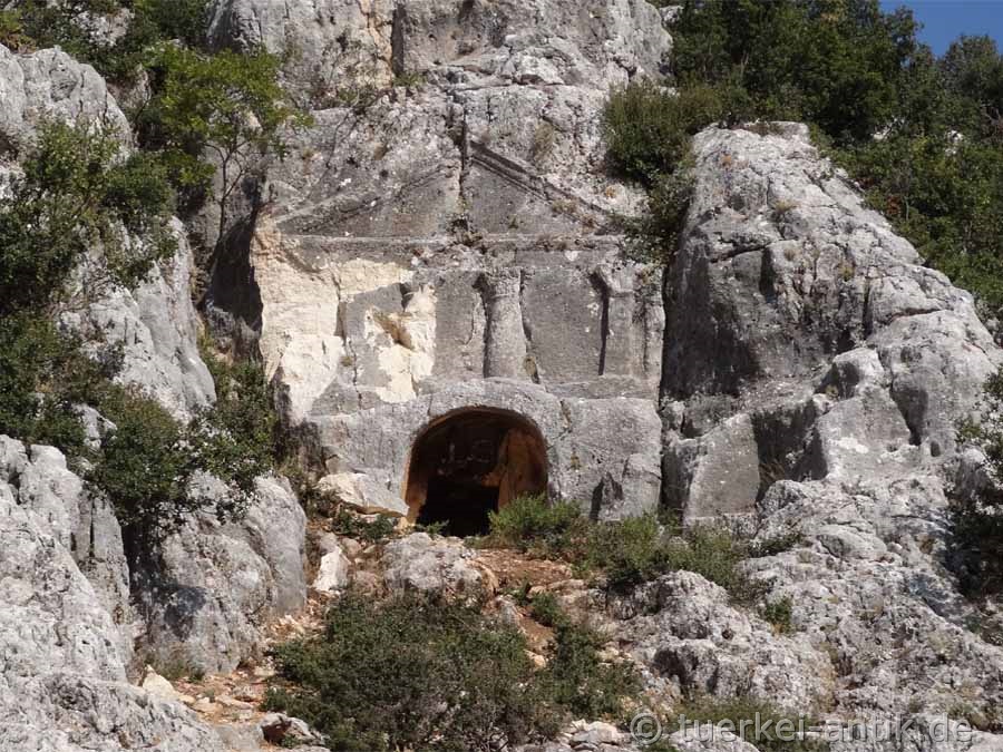 100 Meter ins Tal hinein befindet sich an der nördlichen Seite ein Felsengrab mit Tempelrelief. Im Felsen um die Grabkammer ist die Fassade eines Tempels mit Gebälk, Säulen und Altar im Relief abgebildet. Die heute noch erhaltenen Grundrisse zeigen, dass die antiken Häuser an den Nordhängen erbaut wurden. |