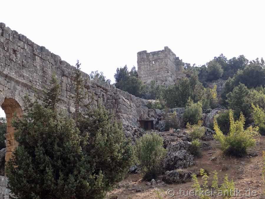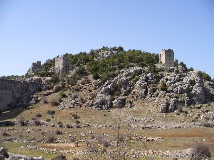Die hellenistische Stadt lag auf dem Hügel und war von einer heute noch teilweise erhaltenen Stadtmauer umgeben. Die Akropolis wurde auf einem 1112 m hohen Hügel mit dreieckiger Grundfläche erbaut. Die Hänge und die Kuppe des Hügels sind mit antiken Bebauungsresten und Zisternen übersät. An der alten Kreuzung der Straßen nach Diokaisareia, Korykos und Seleukeia sind heute die Reste des Nymphäums zu sehen. |