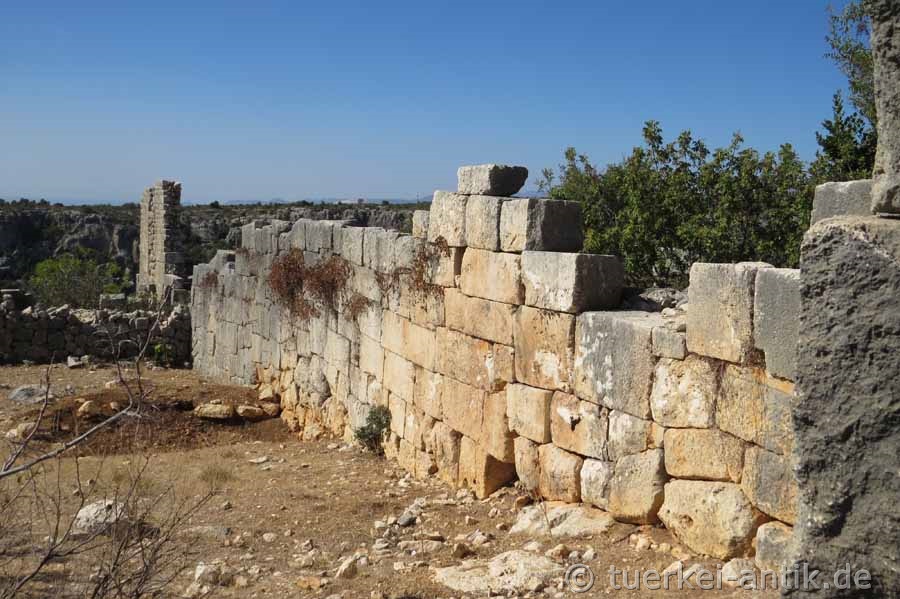 Eine von West nach Ost verlaufende, vermutlich späthellenistische Mauer teilt den Ort in zwei Abschnitte.