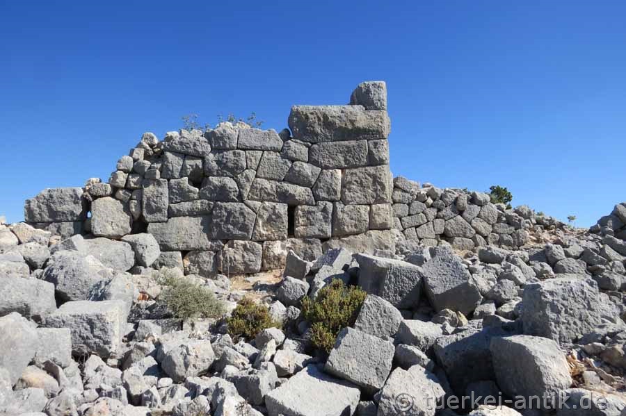 Die jüngsten Häuser sind in Polygonalmauerwerk und Großquadern gemauert und stammen aus der römischen Kaiserzeit. Das für die frühbyzantinische Zeit typische Kleinquaderwerk taucht nicht auf, auch wenn auf einigen Türstürzen Kreuze zu sehen sind. |