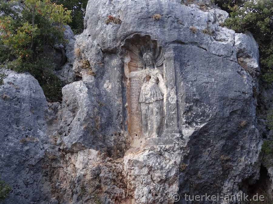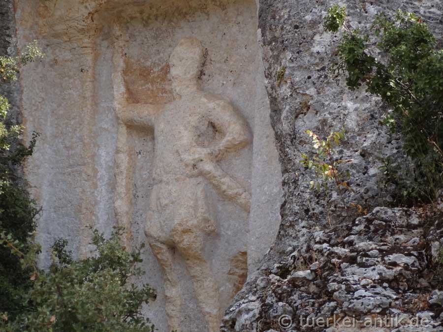 Etwa 600 Meter nordwestlich vom Athena-Relief liegt das Kriegerrelief von Efrenk in einer Felswand neben einem steilen Weg, der zum Fluss Lamos führt. Das Relief ist etwa fünf Meter über dem Straßenniveau in die senkrechte Felswand gearbeitet. Es hat eine Höhe von 1,90 Metern. Es zeigt frontal einen stehenden Krieger, der von einem Naiskos umrahmt ist. |