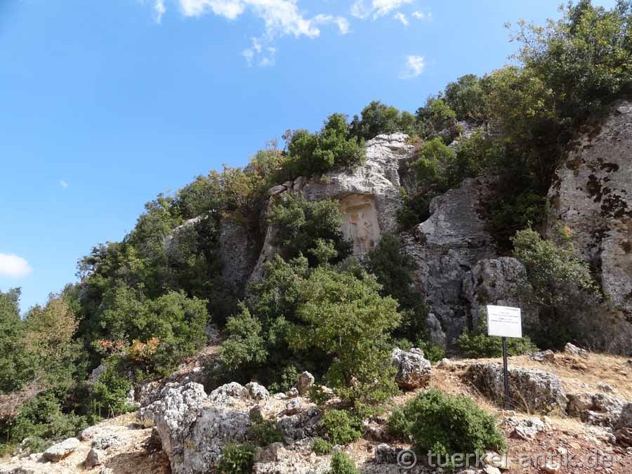 Das Dorf Sömek liegt etwa 15 Kilometer von der Mittelmeerküste entfernt im bergigen Hinterland von Kızkalesi. Vermutlich im 2. Jahrhundert wurde im Norden des Dorfes zu Ehren der Göttin Athena ein Relief in einen Felsblock gemeißelt. |