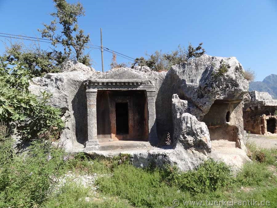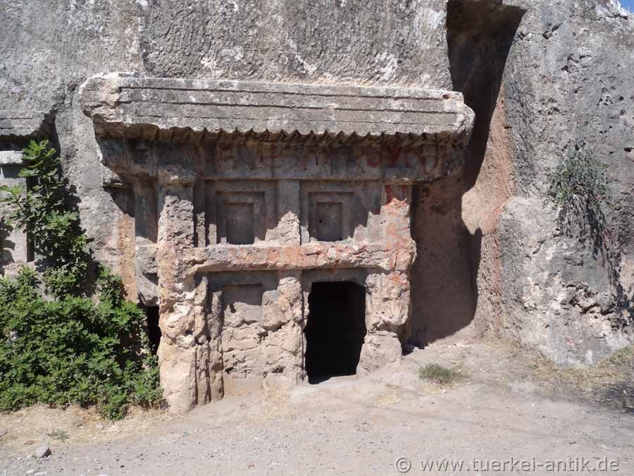 liegt in der Nähe dem heutigen Dorf Ören. Die Straße führt schnurgerade in die Ortschaft Kemer. In Kemer halten Sie sich links, überqueren die Brücke über den Fluß Koca Çayı und biegen gleich nach der Brücke nach rechts, Richtung Ortaköy ab. Nach gut 12 km erreichen Sie Ortaköy. Durchqueren Sie die Ortschaft und folgen sie der Ausschilderung nach Ören. Nachdem Sie den durch das aus dem Gebirge mitgerissene Geröll zu beachtlicher Breite ausgewaschenen Koca Çayı erneut überquert haben, erreichen Sie nach weiteren 2,5 km die direkt an der Straße liegenden Felsengräber von Araxa. |