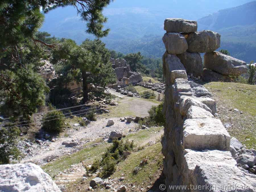 Arykanda liegt an der Straße zwischen Finike und Elmalı, 32 km nördlich von Finike. Die Ruinen der antiken Stadt liegen auf Terrassen an einem Steilhang zwischen 710 und 820 Höhenmetern. Die Anlage bietet von allen Terrassen einen weiten Blick auf die umliegenden Berge und ins Tal. Diese dem antiken Delphi ähnliche Topografie hat dem Ort die Bezeichnung „Delphi Lykiens“ eingetragen. |