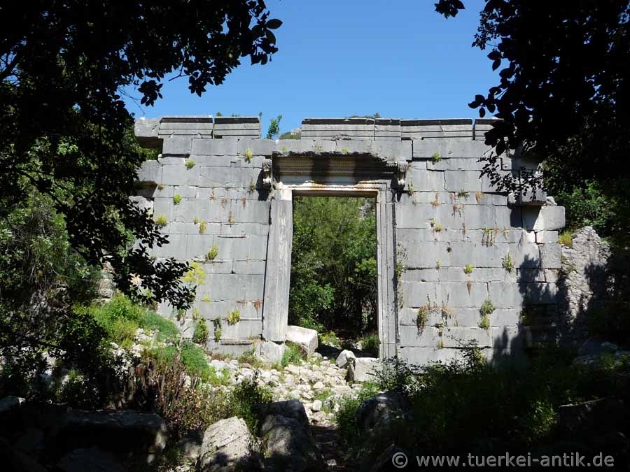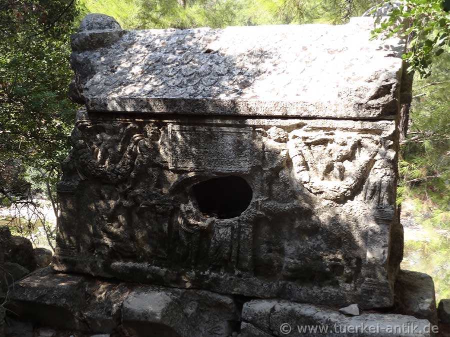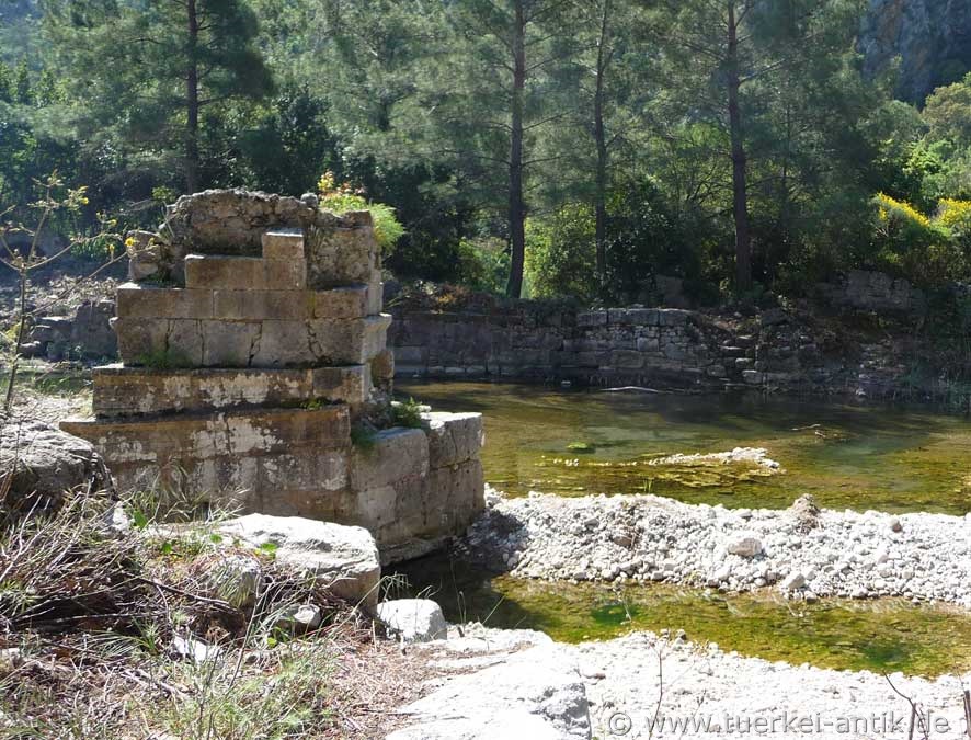 Lange Zeit war Olympos völlig vergessen. Die Stadt war durch einen Bachlauf in zwei Hälften geteilt. Die Reste einer Brücke sind noch auszumachen. Leider sind die noch bestehenden Bauten, wie z.B. ein kleines römisches Theater, die Reste eines Tempels aus dem 2. Jh. v. Chr. sowie eine Basilika aus byzantinischer Zeit stark verfallen und weitgehend überwuchert. Unübersehbar ist die Nekropole mit zahlreichen Gräbern, die jedoch nicht alle lykischen Ursprungs sind. |