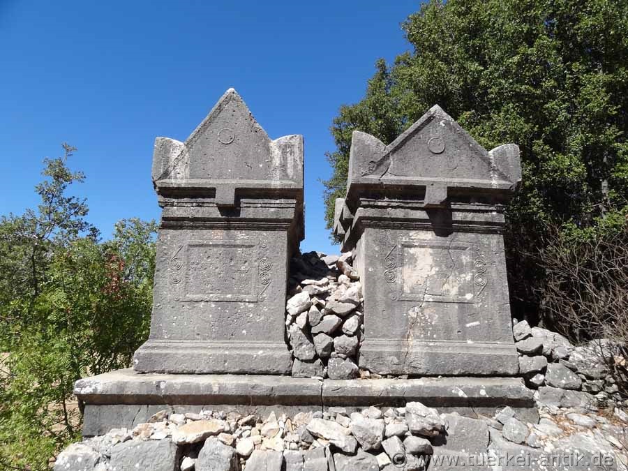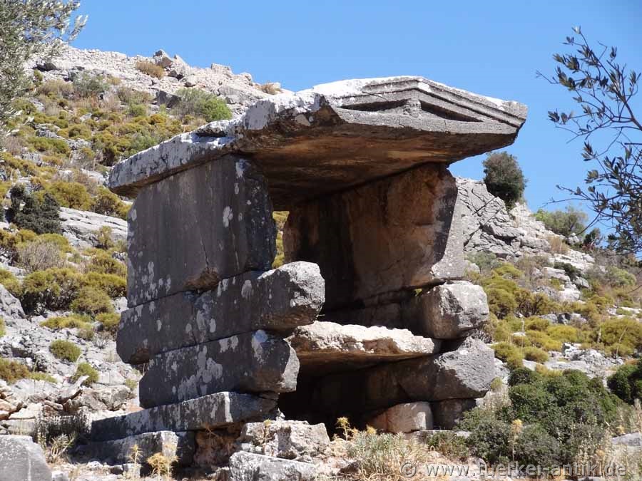 Sie erreichen Sidyma aus Richtung Antalya/Kalkan kommend über die Nationalstraße D400. Beim Dorf Gölbent führt gleich nach einer langgezogenen Kurve links eine braun ausgeschilderte Straße nach Sidyma ab. Der weitere Weg ist ausgeschildert, allerdings ist an Abzweigungen Aufmerksamkeit erforderlich, da nicht alle Schilder gut sichtbar sind. Achten Sie auch auf die Ausschilderung nach Doduga. Das ist das Dorf auf dem ehemaligen Stadtgebiet von Sidyma. An der Moschee können Sie gut parken und mit der Besichtigung beginnen. Von Fethiye kommend fahren Sie erst auf der Nationalstraße D400, Richtung Antalya. Ca. einen Kilometer vor der Ortschaft Eşen zweigt rechts eine braun ausgeschilderte Straße nach Sidyma ab. Der weitere Weg ist ausgeschildert, allerdings ist an Abzweigungen Aufmerksamkeit erforderlich, da nicht alle Schilder gut sichtbar sind. Achten Sie auch auf die Ausschilderung nach Dodurga. Das ist das Dorf auf dem ehemaligen Stadtgebiet von Sidyma. An der Moschee können Sie gut parken und mit der Besichtigung beginnen. |