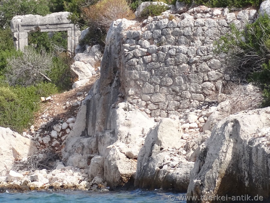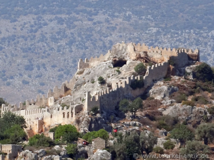 Auf den Resten der antiken lykischen Stadt Simena befindet sich heute das Dorf Kaleköy (türkisch für "Burgdorf" Der Ort ist auch heute noch nur zu Fuß oder mit dem Boot erreichbar. |
