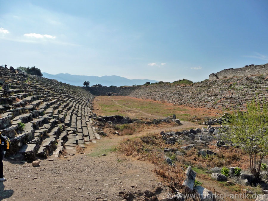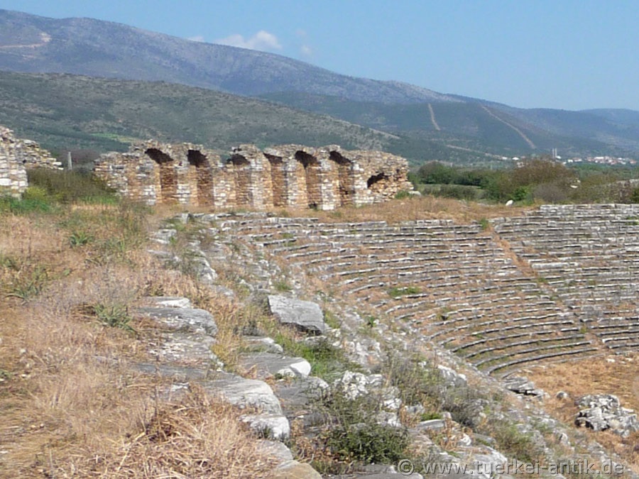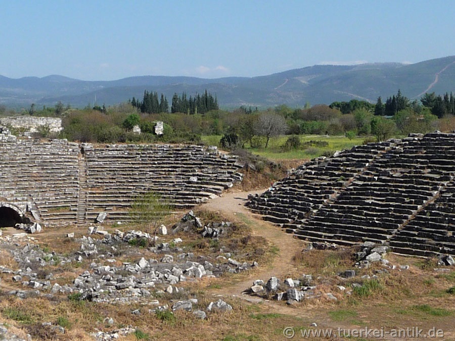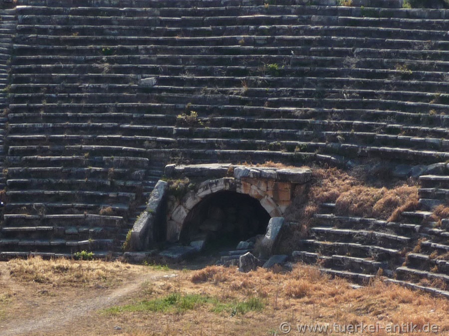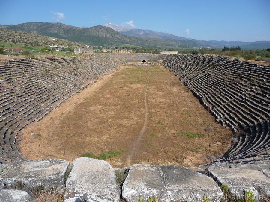 Unlike, for example, the construction of the Perge stadium, the substructure of the rows of seats was largely made up of mounds of earth. This is an indication that the original building of the stadium was already built in Hellenistic times. Another special feature of this stadium is that it is closed on both narrow sides. Thus it differs clearly from the mostly horseshoe-shaped stadiums of the Roman epoch. |