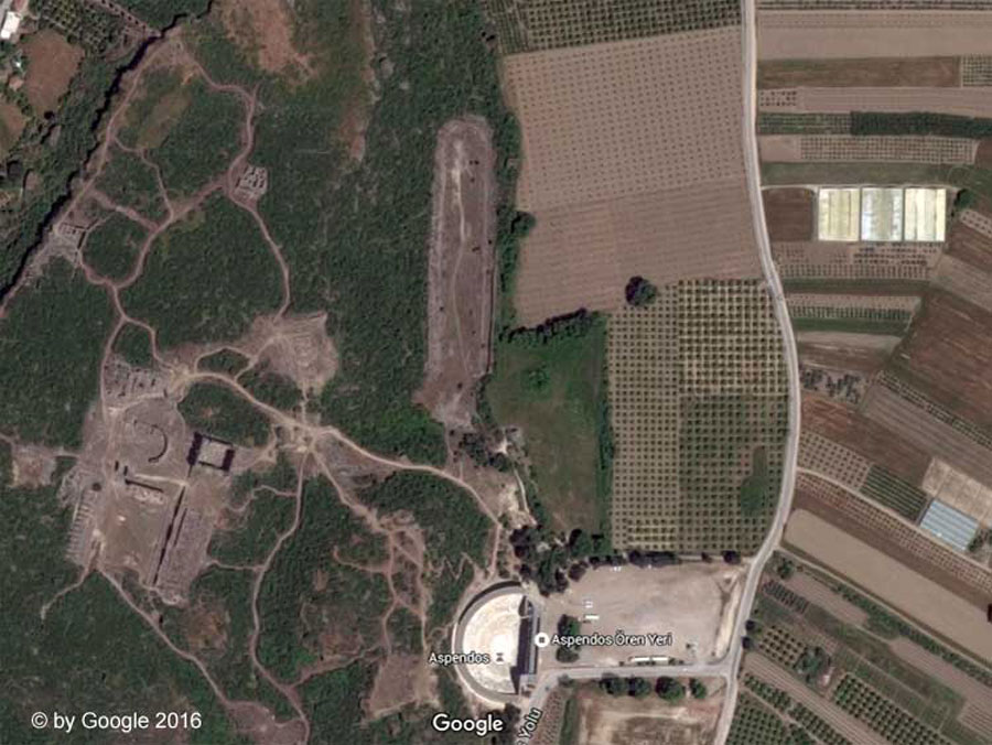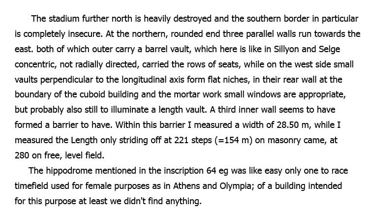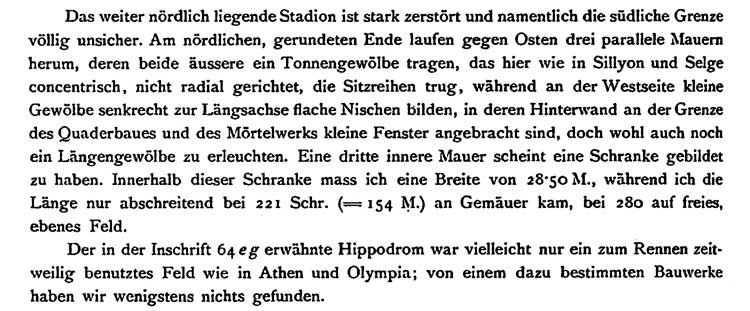 Parts of the grandstands and the shops are still visible. The best preserved part can be found on the northwestern side of the hill. The Austrian explorer Karl Graf Lanckoroński wrote already in 1890 in his book "Städte Pamphyliens und Pisidiens" about the stadium of Aspendos: |