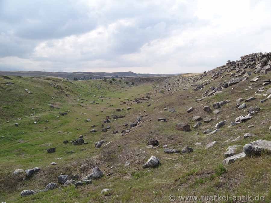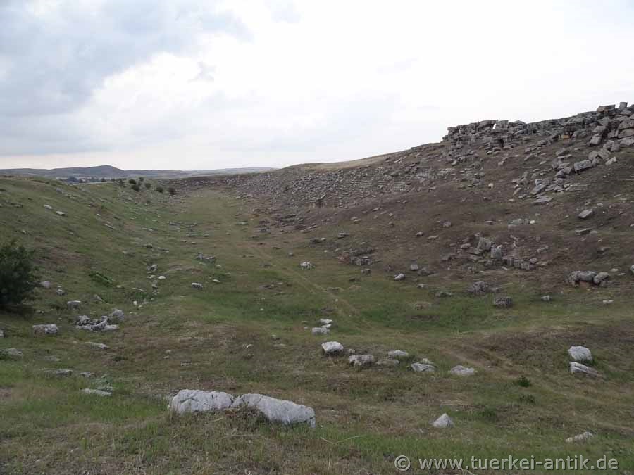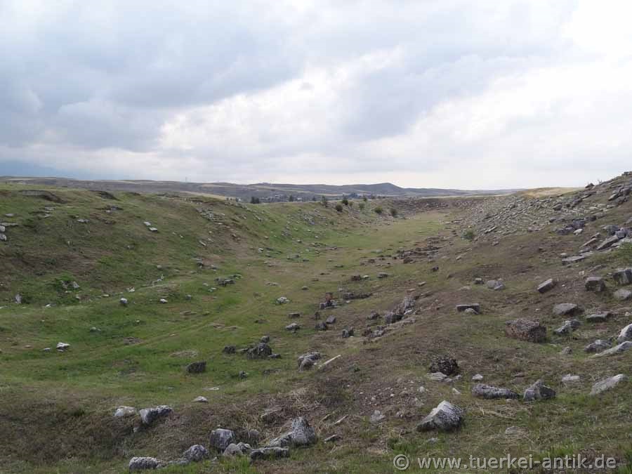 The stadium of Laodikeia at Lykos (or Laodicea ad Lycum) was integrated under Vespasian (Roman emperor from 69-79 AD) or Titus (79-81 AD) into a natural depression at the southern end of the city. It is probably a horseshoe-shaped structure common in Roman times. The archaeologists of the University of Denizli conclude this from the flattened structure on the east side, especially since no remains of the benches can be found here. On the north-east side of the stadium are the huge remains of a gymnasium with a large swimming pool. The 133 x 75 metre complex was built according to an inscription on the occasion of the visit of Emperor Hadrian and his wife Sabina in 135 AD. In Hellenistic times, sports such as wrestling, boxing, discus and javelin throwing as well as running competitions found a wide audience. In the original sense of the word, a stadium was defined as an ancient Greek measure of length with a distance of 600 feet, which corresponds to a length between 165 and 196 m, depending on the regional measure of foot. The exceptional length of 280 metres is explained by a forecourt on which the young men of the gymnasium completed their daily training. |