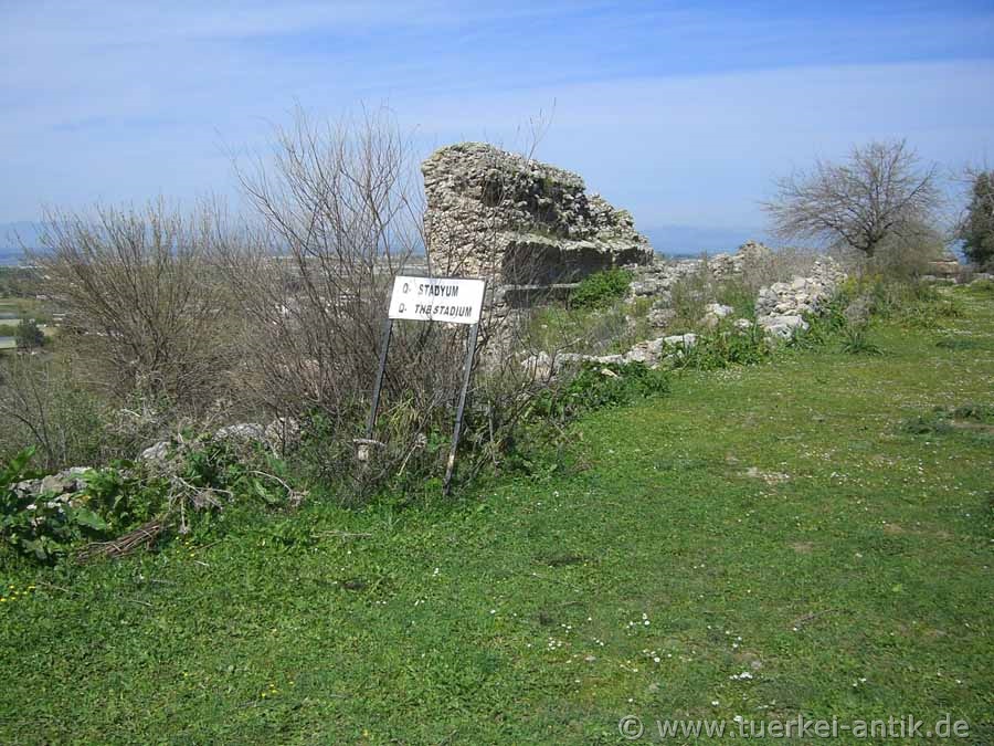 The stadium of Sillyon is hardly recognizable as such anymore. The design of the stadium, as well as the finds in the area of the stadium, indicate both Greek-Hellenistic and early Roman construction activity and use. One searches in vain for the remains of the rows of seats. Archaeologists at the University of Antalya suspect a reuse of the seat stones in the stadium of the nearby Perge.