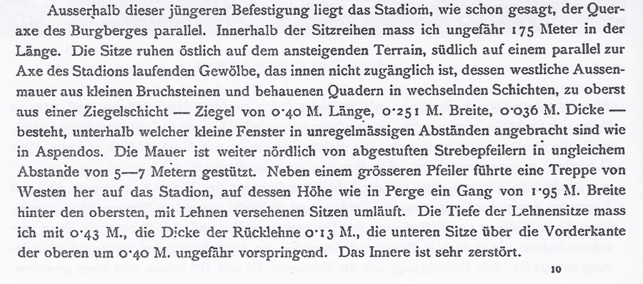 Already around 1890 the Austrian-Polish explorer Karl Graf Lanckoroński reported in his book "Städte Pamphyliens und Pisidiens" Volume 1, on page 73, that the interior of the stadium was heavily destroyed. At that time, the state of preservation was apparently even more significant.