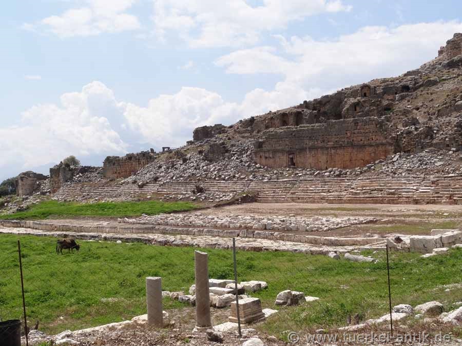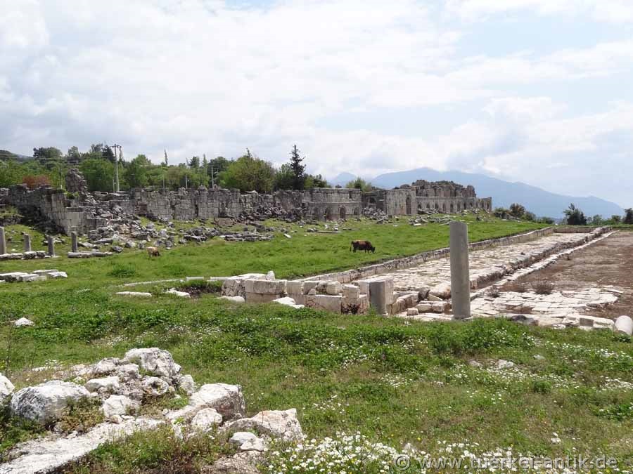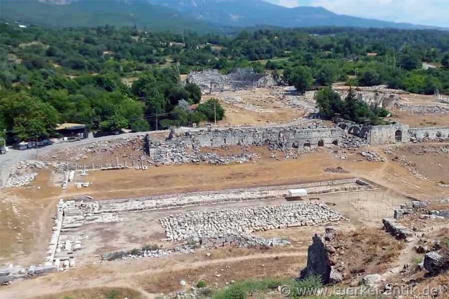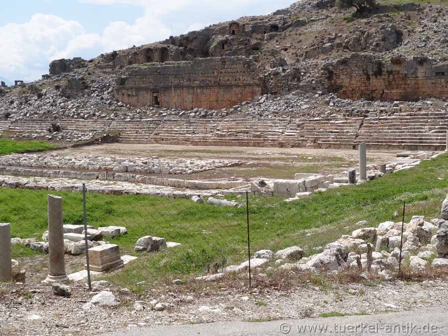 The Tlos Stadium is located at the foot of the Acropolis. According to today's knowledge, it only offered space for about 2,500 spectators. The retaining wall above the spectator terraces was probably fortified during the Roman Empire using spoilers. Today, only the spectator stands can be seen on the mountain side. Whether there is evidence for rows of seats built on substructures in Roman times and later removed was not known. Nor was it possible to determine whether wooden grandstands were used. The 75 metre long and 8 metre wide fortified foundation could indicate this. At least one access led from the mountain side through the retaining wall directly to the spectator stands. |