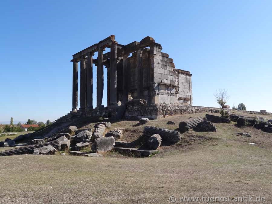 The temple of Zeus is preserved in its originality. It is considered one of the best preserved Roman temples in Turkey. Of the original 48 Ionic columns of the temple - 15 on the long sides and 8 on the short sides - only the columns on the western and northern sides remain today. One long side and one short side of the cella are preserved. |