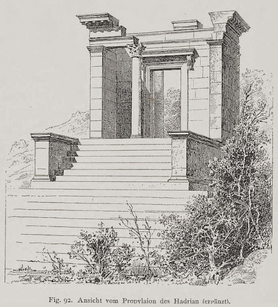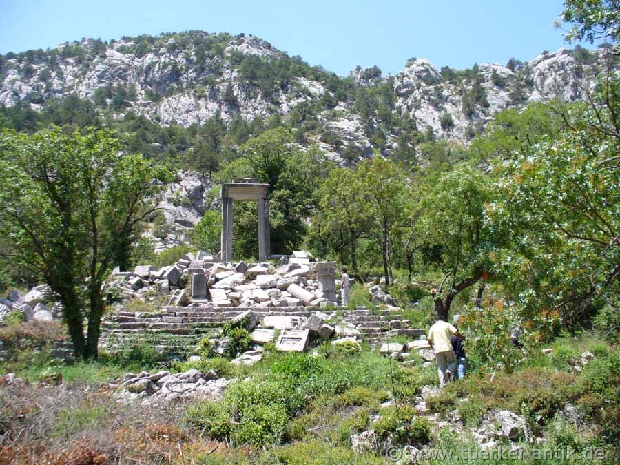 Karl Graf Lanckoroński wrote in 1892, freely taken over: The traveller entering this valley, surrounded by wooded hills, is struck above all by a doorway that rises above the bushes, the remains of a gate to which a wide staircase leads in two steps. The staircase is almost completely preserved; the presence of columns at this point is evidenced by the discovery of column drums and a 2.2 m cantilevered architrave spanning the central intercolumnum. Friezes and cornices were also found. A few steps behind this propylaion lie the ruins of the temple. It was an ionic peripteros with a cella about 8 m wide. We noted canneled column drums up to 1.02 m diameter, furthermore attic wall and column bases, as well as ionic capitals. |