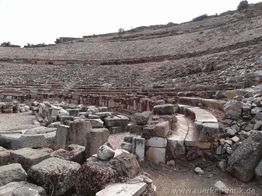 konfiszierten sämtliche Schätze und Besitztümer. Viel ist von der einst stolzen Stadt nicht erhalten. Die Ruinen der Stadt umfassen unter anderem das Theater, einen Tempel des Apollon Isotemos aus dem 2. Jh. v. Chr. , ein Bouleuterion (22 x 35 m) und eine nur noch im Ansatz erkennbare Agora (112 x 72 m). Weiter sind einige Türme der Stadtmauer und zahlreiche Gräber in einer großen Nekropole erhalten. Bei Ausgrabungen kamen einige wenige Inschriften zutage. Bis um die Mitte des 3. Jahrhunderts n. Chr. prägte die Stadt eigene Münzen. In byzantinischer Zeit erhielt die Stadt einen Bischofssitz, dessen Besetzung anhand von Quellen für die Jahre von 451 bis 879 nachvollziehbar ist. |