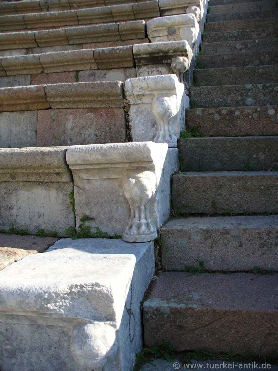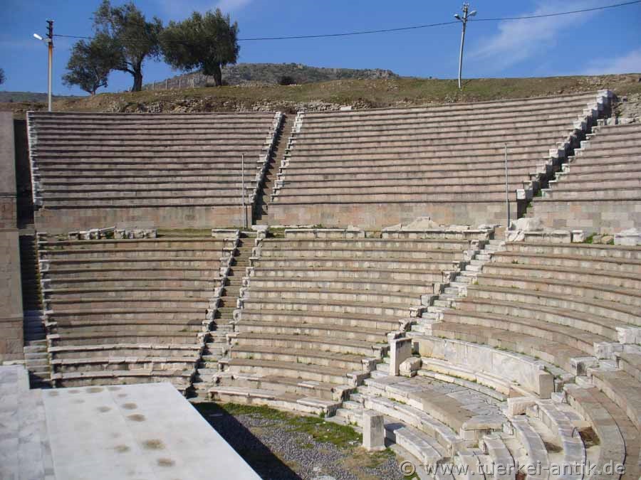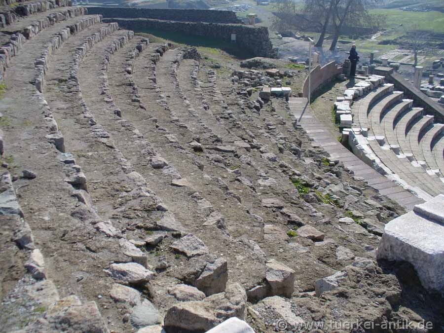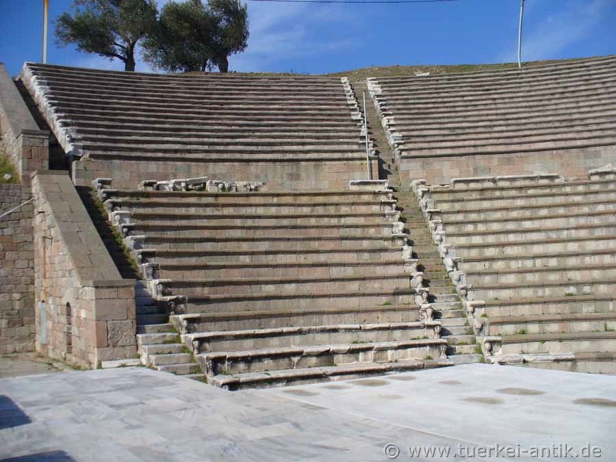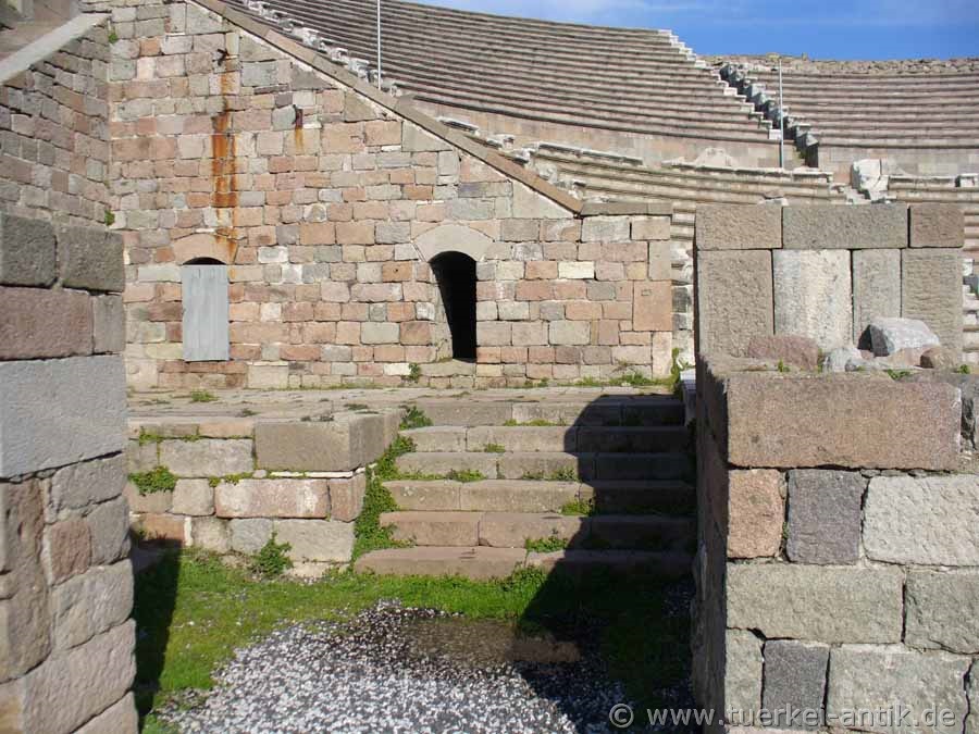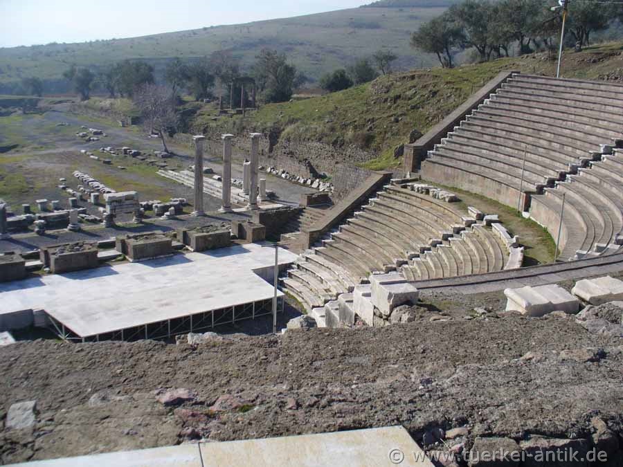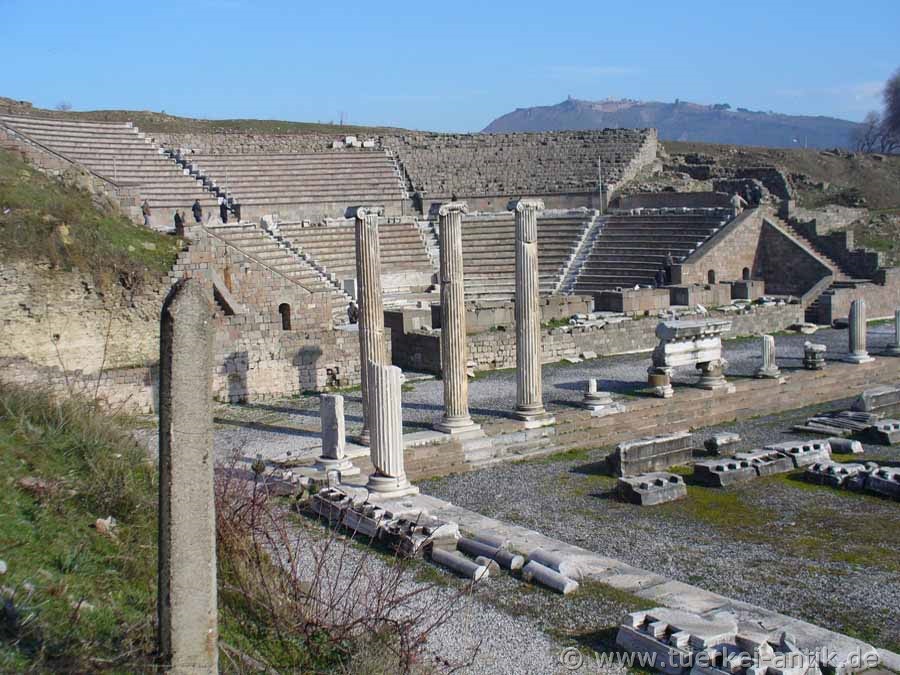 Das (römische) Theater im Asklepieion von Pergamon wurde unter Kaiser Hadrian (römischer Kaiser von 117 n. Chr. bis 138) errichtet. Vermutlich handelt es sich aber um eine Überbauung eines griechischen Vorgängerbaus. In der Mitte des unteren Ranges befand sich eine Ehrenloge, deren Aussparung in den Sitzreihen sichtbar ist. Vom Bühnenhaus sind nur noch Mauerreste erhalten. |
