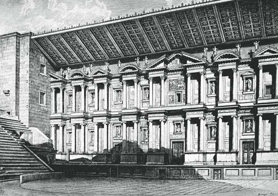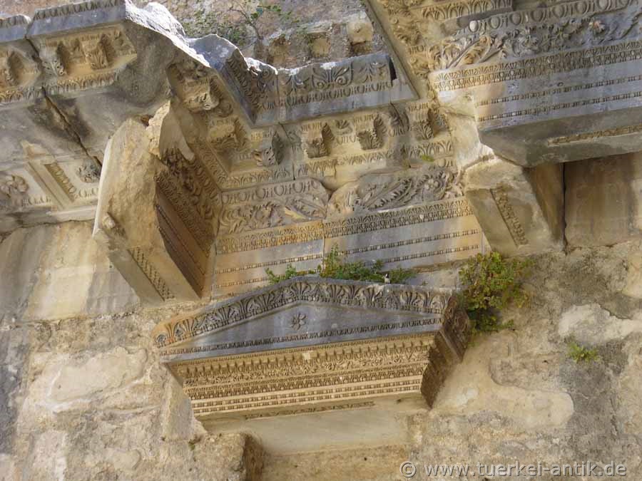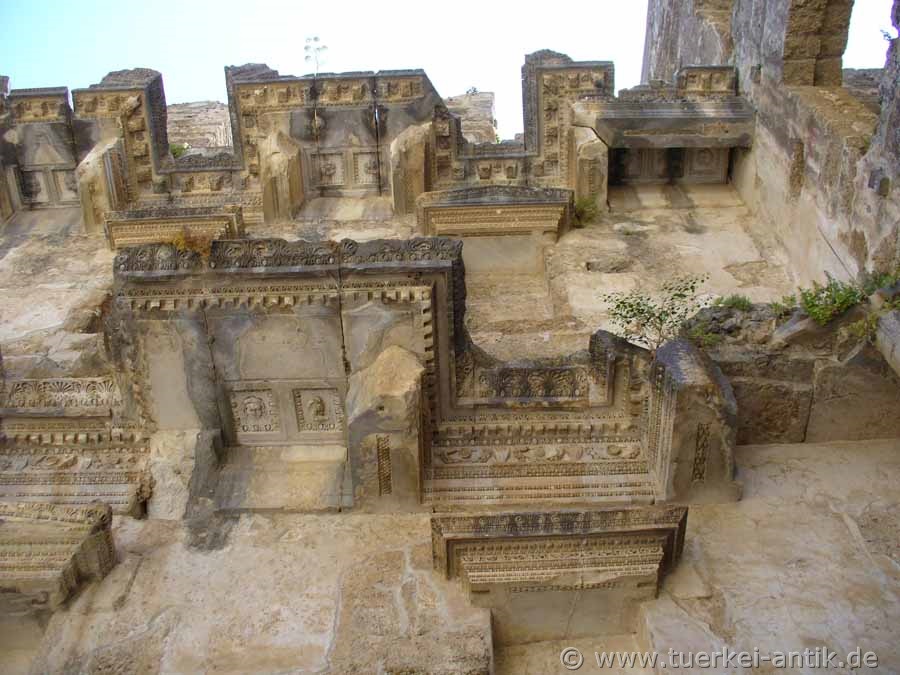 Die Zeichnung (nach Karl Graf Lanckoroński) zeigt die zeichnerische Rekonstruktion der dem Zuschauer zugewandten Seite der Bühnenwand (scaena_frons). Unterhalb der Mauerkrone sind noch heute die Einlassungen erkennbar, auf denen die hier gezeichnete schräge Holzkonstruktion ruhte, welche die Bühne überspannte und für eine noch bessere Akustik sorgte. |