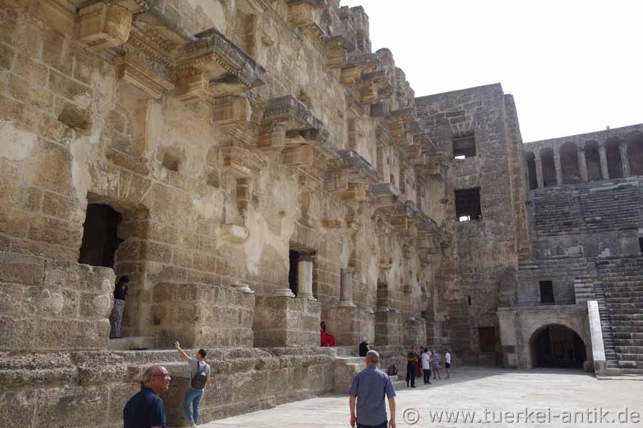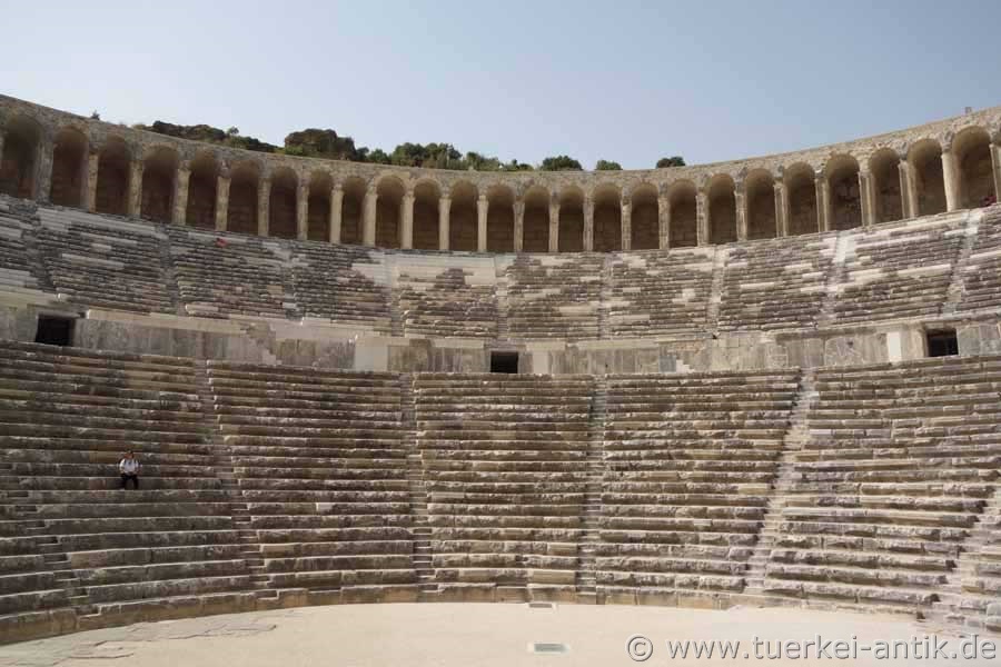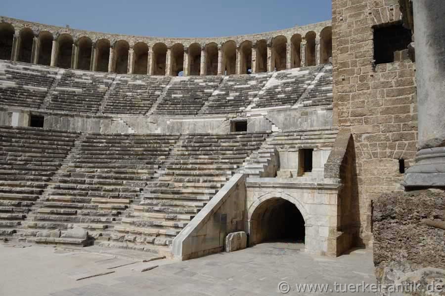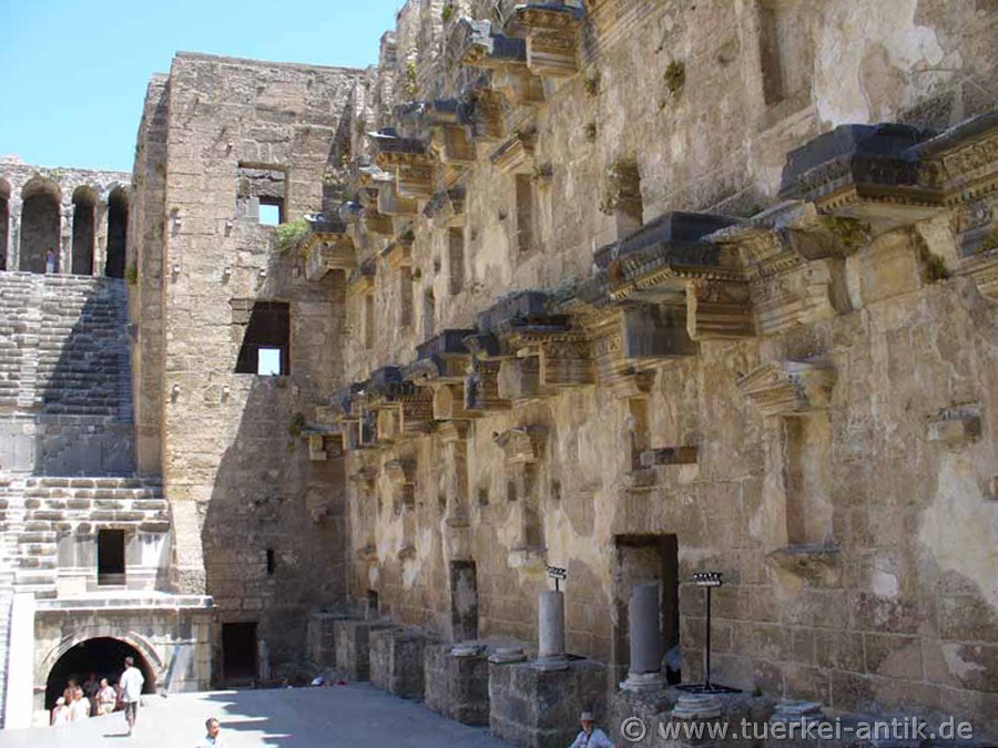 Das Theater von Aspendos ist römischen Ursprungs. Das Bühnenhaus ist in vollständiger Höhe erhalten geblieben und zählt damit zusammen mit den Theatern in Orange (Südfrankreich) und Bosra (Syrien) zu den drei letzten antiken Theatern mit noch vollständig intaktem Bühnenhaus. Unterhalb der Mauerkrone sind noch die Einlassungen erkennbar, auf denen eine schräge Holzkonstruktion ruhte, welche die Bühne überspannte und für eine noch bessere Akustik sorgt. Die cavea umfasst 39 Sitzreihen, die durch einen Zwischengang (diazoma) geteilt werden. Da die Seldschuken das Theater im Mittelalter als Karawanserei nutzten, wurde es fortwährend repariert und nach Erdbeben wieder hergerichtet. Dieses erklärt den guten Erhaltungszustand im Vergleich zu anderen Theatern dieser Zeit. Im Jahr 2015 wurden im Auftrag des Ministeriums für Tourismus und Kultur zwischen den grauen Originalstufen neue Sitzplätze aus schneeweißem Marmor eingebaut. Leider ist festzustellen, dass dieses Vorgehen keinen Einzelfall darstellt. Das Erscheinungsbild etlicher antiker Theater hat unter Verwendung eben solchen Marmors erheblich gelitten. Beispiele hierfür sind die Theater von Telmessos (Fethiye) und Rhodiapolis. |