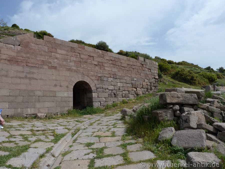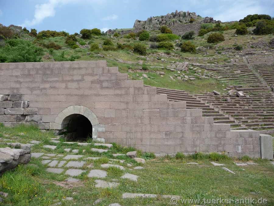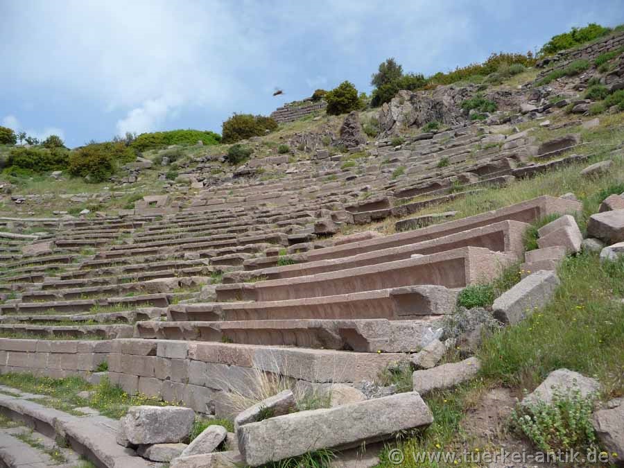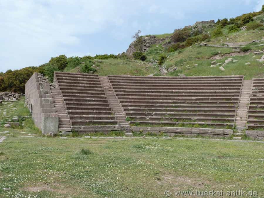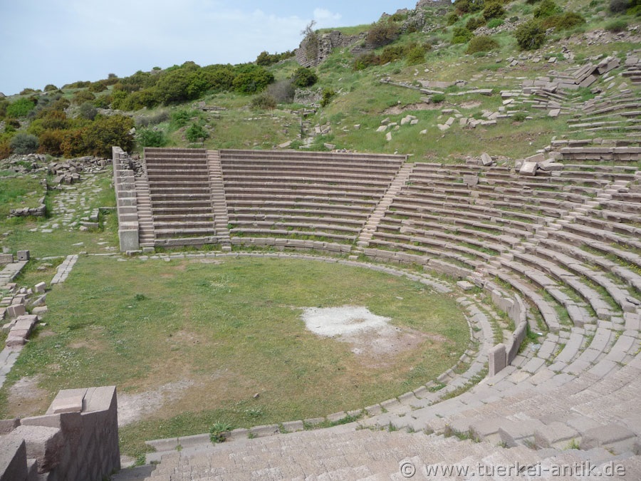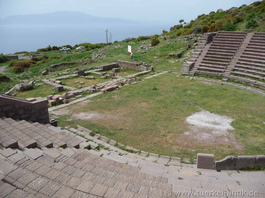 Das griechische Theater von Assos wurde in eine natürliche Felsausbuchtung in den Hang unterhalb des Athenatempels gebaut. Es dem Meer und der Insel Lesbos zugewandt. Forschungserlebnisse der letzten Zeit deuten darauf hin, dass es auf es an der Stelle eines noch älteren Theaters errichtet wurde. Mehrere Erdbeben und Erdrutsche haben dem Theater arg zugesetzt. So ist nur der untere der drei Ränge vollständig erhalten. Vom Bühnenhaus sind die Fundamente des Erdgeschosses gut erhalten. Es war 19,5 Meter breit und zweigeschossig ausgeführt. Bühnenhaus und proskenion deuten auf frühhellenistischen Ursprung hin. Die Ausführung des Bühnenbaus entspricht dem des (viel besser erhaltenen) Theaters von Priene. |