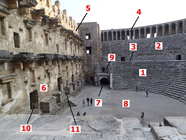 brachte gegenüber der griechischen Bauweise das Überwölben der seitlichen Zugänge zum Zuschauerraum (7 = Parodoi),