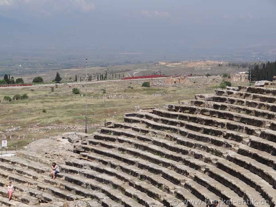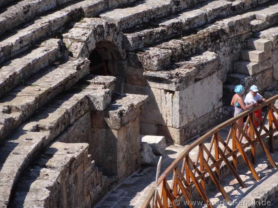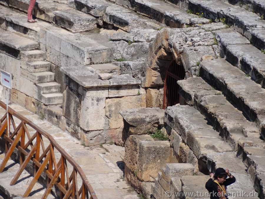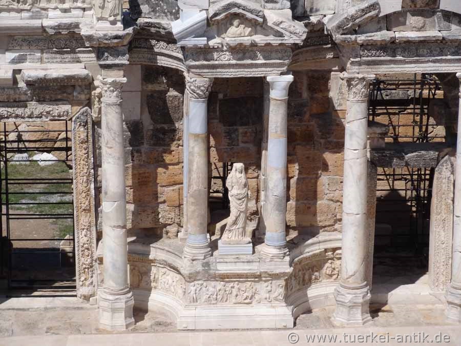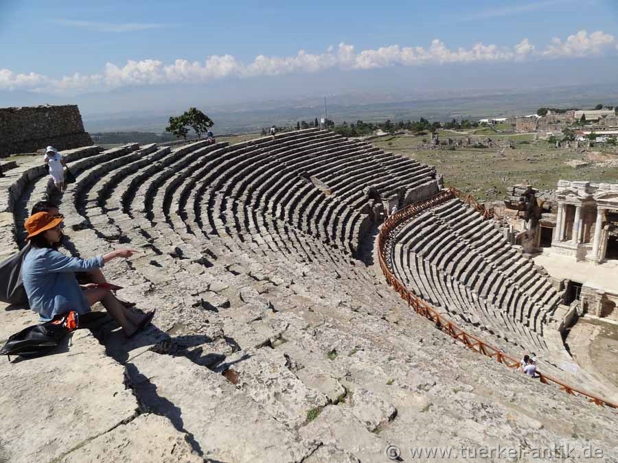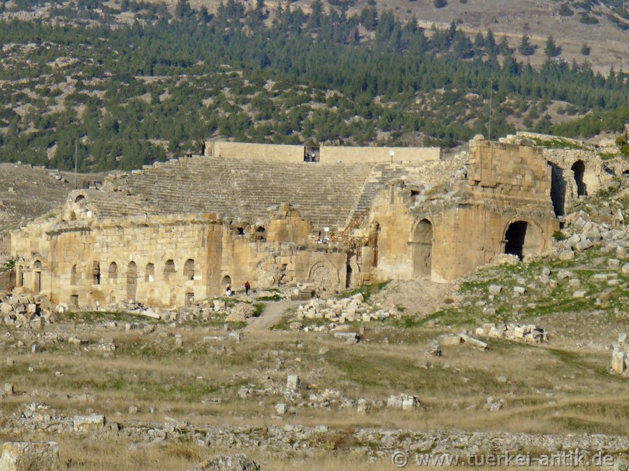Das Theater erfuhr in Laufe der Zeit immer wieder Restaurierungen und kleinere Erweiterungen. Anlässlich des Besuches Kaiser Hadrians in Hierapolis im Jahre 129 n. Chr. erfuhr das Bühnenhaus umfangreiche Erweiterungen. |