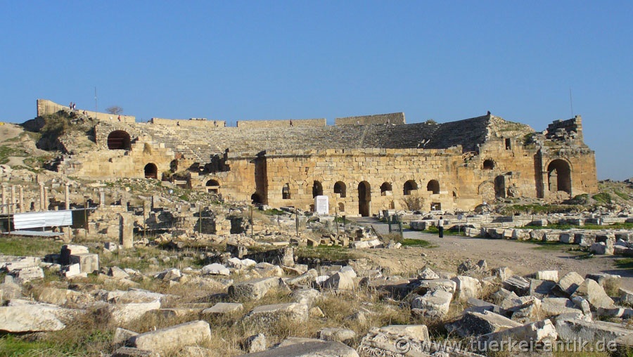 Hierapolis war eine antike griechische Stadt an der Straße von Sardeis (oder Sardes) nach Apameia. Der Ort war schon im Altertum berühmt für die warmen Quellen, deren Wasser beim Verdunsten weiße Kalksinterterrassen entstehen lässt. Das Wasser diente zur Färbung von Wolle. Weberei und Textilhandel bildeten die Grundlagen des Reichtums der Stadt. Schon die Römer kamen nach Hierapolis, um sich in den Thermalquellen zu entspannen, sich zu erholen oder um verschiedene Beschwerden zu kurieren. Mittelpunkt dieser Bäder-Stadt, die in der römischen Kaiserzeit ihre Blüte erlebte, waren die Thermen und der Tempelbezirk. Ein gewaltiger Bäderkomplex zeugt noch heute von der Beliebtheit der ca. 30-50 °C heißen Thermen. Auch wenn die Stadt, wie ein mutmaßlich alter Kybelekult zeigt, wohl schon früher bestand, stammen die ältesten Zeugnisse aus dem 3. Jahrhundert v. Chr. Hierapolis wurde, ebenso wie die Nachbarstadt Laodikeia am Lykos, durch Antiochos II (286 bis 246 v.Chr.) gegründet. Die älteren Siedlungsspuren sind durch Travertinschichten überdeckt. Durch Erdbeben wurde die Stadt 17 n. Chr. zerstört, danach aber in erweiterter Gestalt wiederaufgebaut. Im ersten und zweiten Jahrhundert entstanden Thermalbäder, Brunnen, Theater und Tempel. Aus dieser Zeit stammen auch die zahlreichen Sarkophage und Gräber in den Nekropolen der Stadt. |