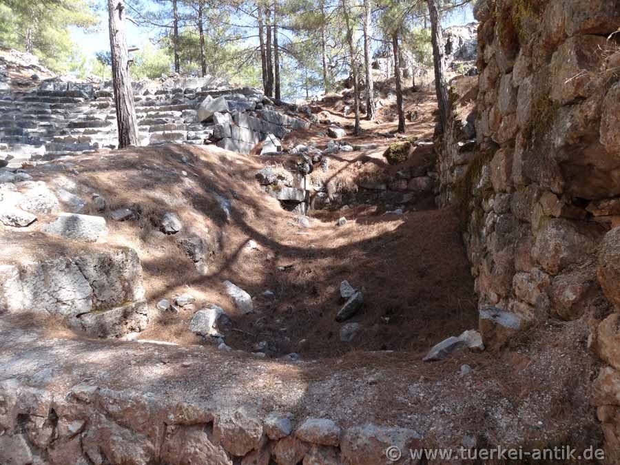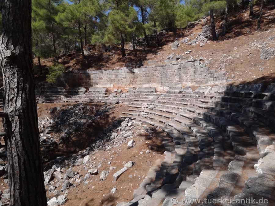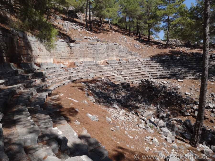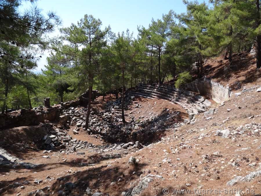 Das vermutlich späthellenistische Theater wurde in eine Felsmulde gebaut. Die cavea weist insgesamt 15 Sitzreihen auf. Die oberste Sitzreihe auf dem, zum Hang hin durch eine Mauer gesicherten Umgang, ist mit Bänken mit Rückenlehnen ausgestattet. Das Bühnenhaus befindet in einem schlechten Erhaltungszustand. |