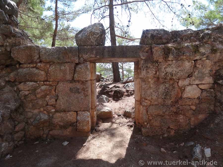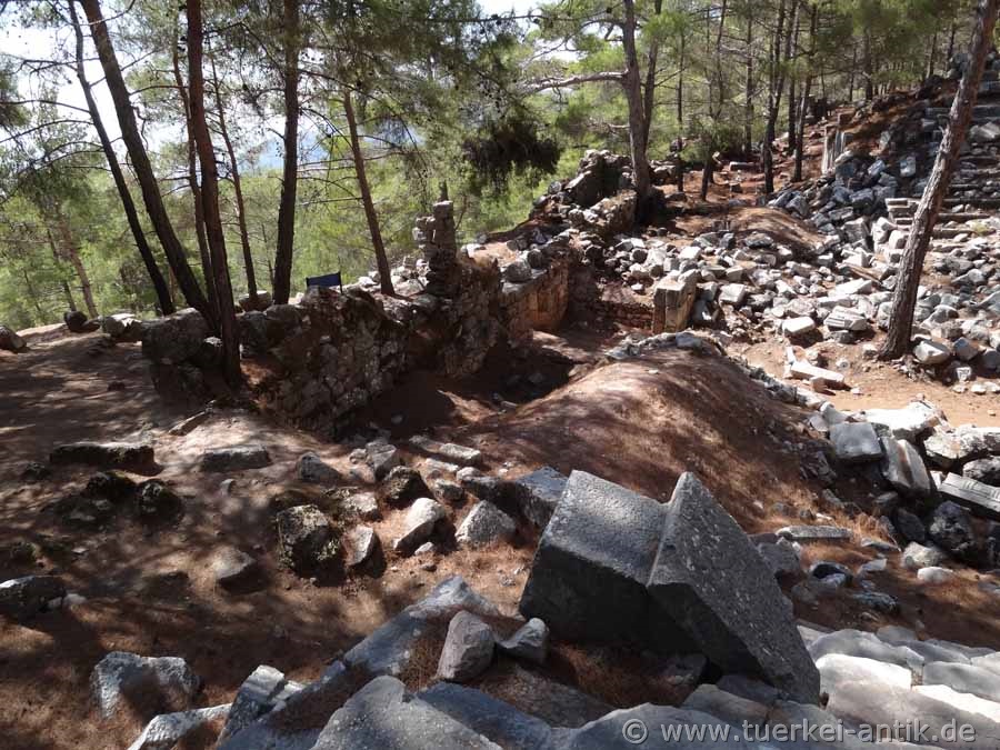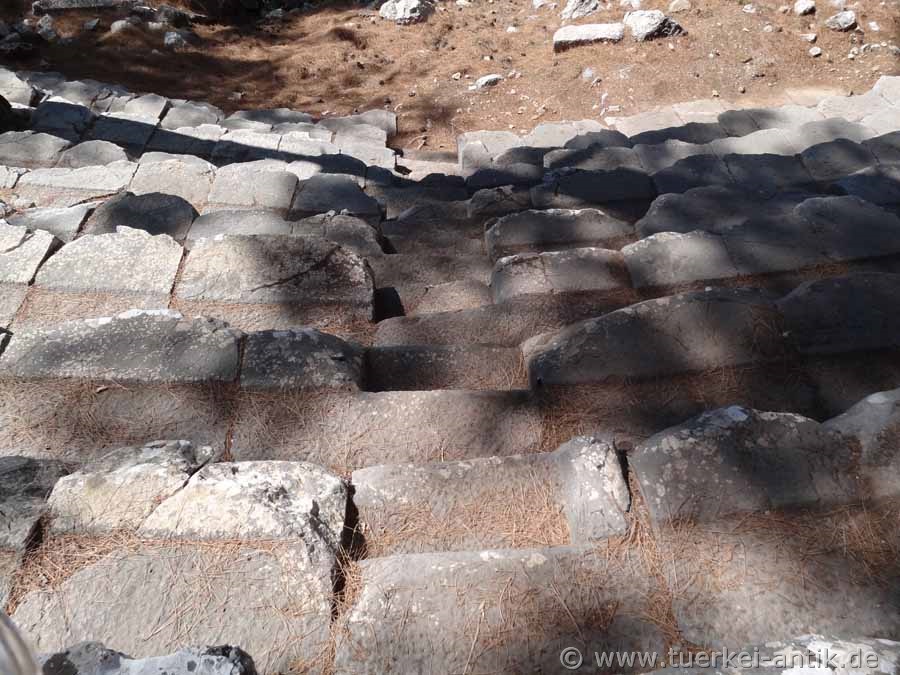 Telmessos. (heute Fethiye). In römischer Zeit erlebte die Stadt einen enormen Aufschwung. Die meisten der heute erhaltenen Bauten wurden in dieser Zeit errichtet oder, wie das Theater, ausgebaut. Bemerkenswert ist das Fehlen von Bauten aus byzantinischer Zeit. Lediglich einige Abschnitte der Befestigungsanlagen sind durch die verwendete Technik byzantinischer Zeit zuzuordnen. Ab dem 4. Jh. n. Chr. sind keine einer späteren Zeit zuzuordnende Funde mehr zu verzeichnen. Die Stadt scheint zu diesem Zeitpunkt verlassen worden zu sein. Die Gründe hierfür sind nicht bekannt. Eine Neubesiedlung erfolgte nicht. |