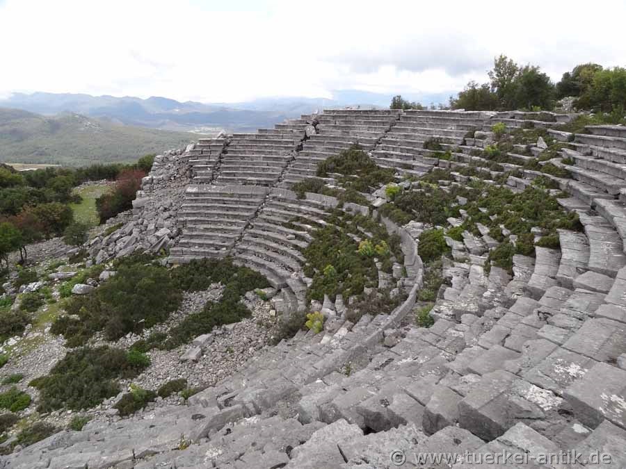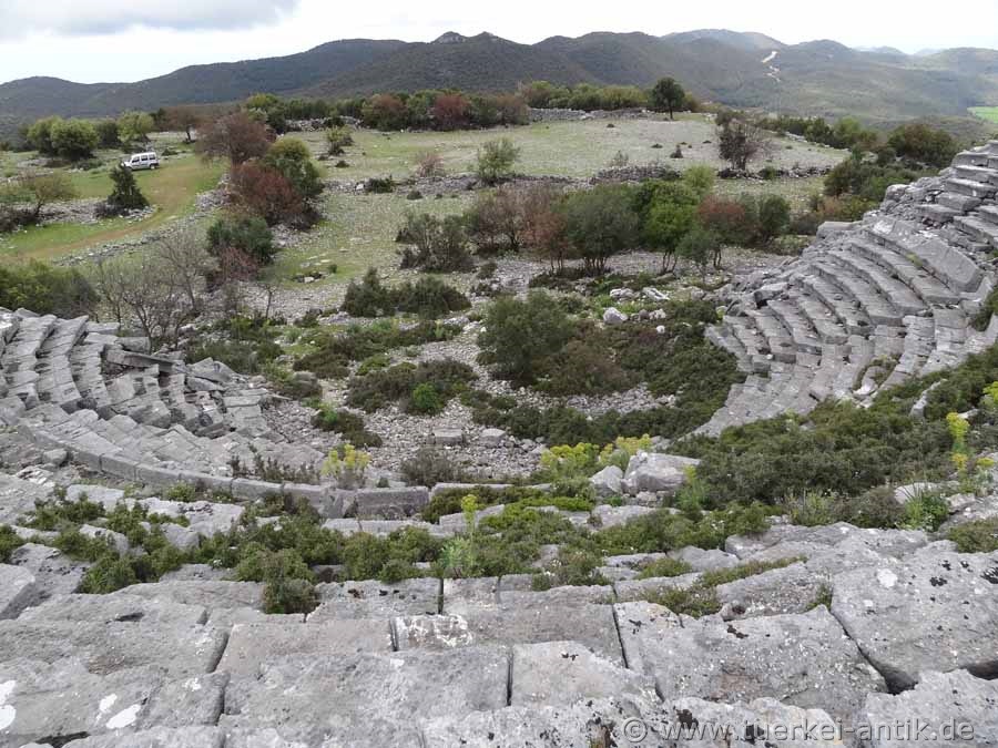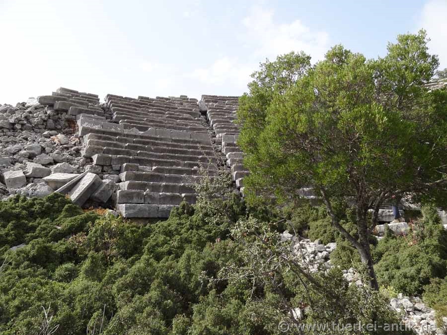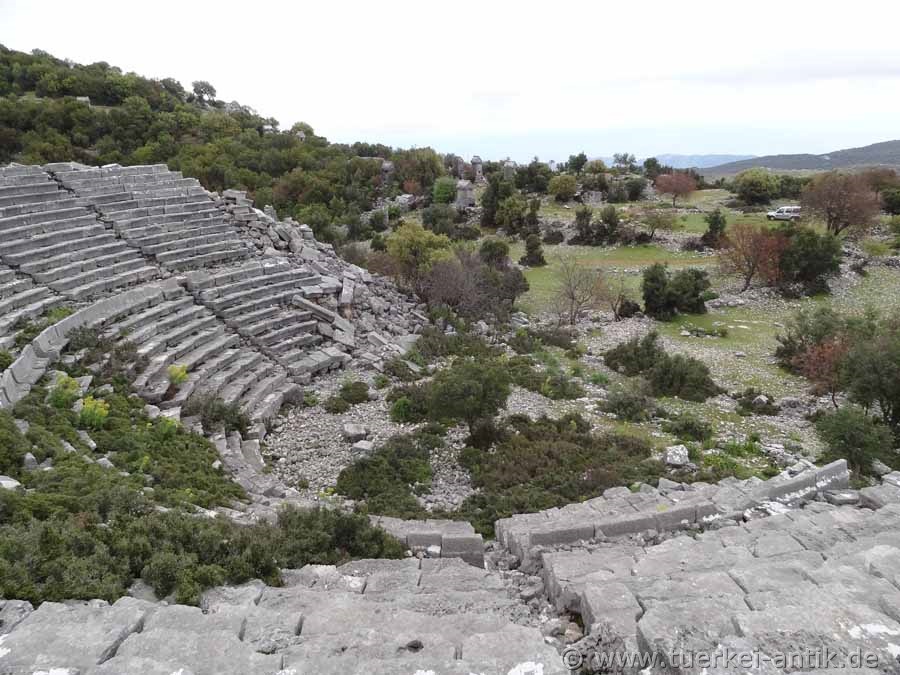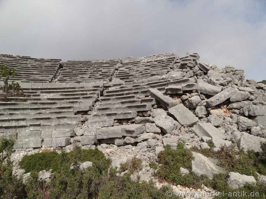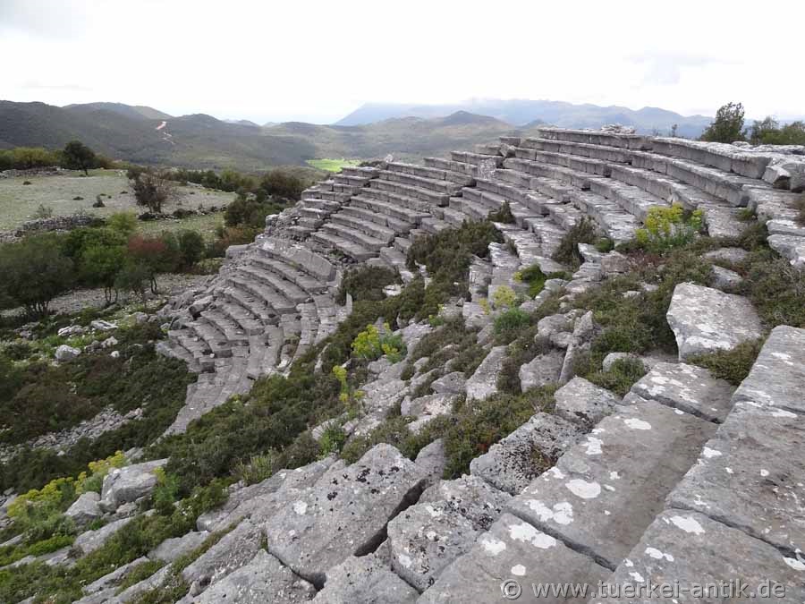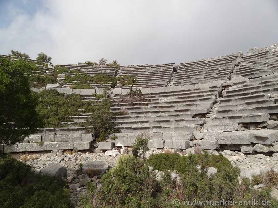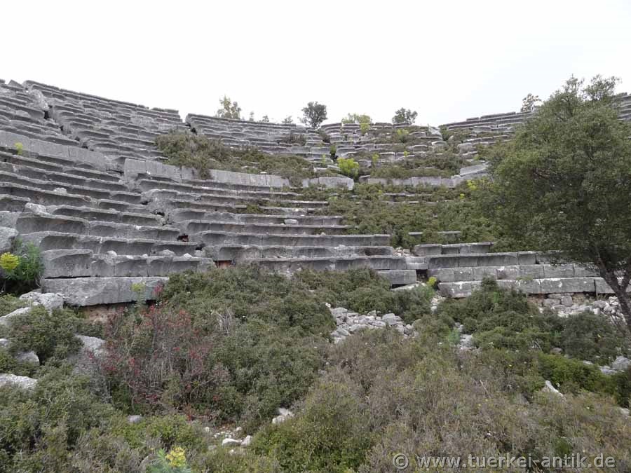 Das hellenistische Theater der antiken Stadt Kyaneai wurde in einen natürlichen Hang gebaut und ist, wie die gesamte Stadt, noch nicht umfassend erforscht und ausgegraben. Das aus dem 2. Jh. v. Chr. stammende Theater ist zweifellos das am besten erhaltene Bauwerk von Kyaneai. |