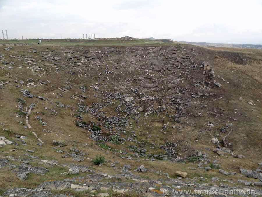 Obwohl viele Sitzreihen von ihren ursprünglichen Positionen gerutscht sind und etliche zur Kalkgewinnung entfernt wurden, kann man im unteren Rang (ima cavea) 19 Sitzreihen und im oberen Rang (summa cavea) 27 Sitzreihen feststellen. |