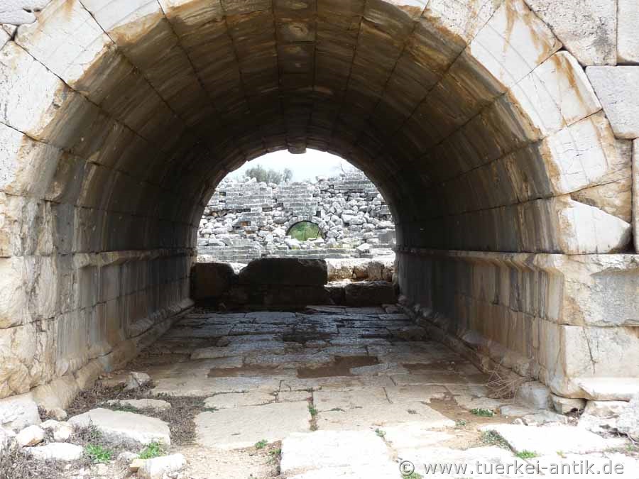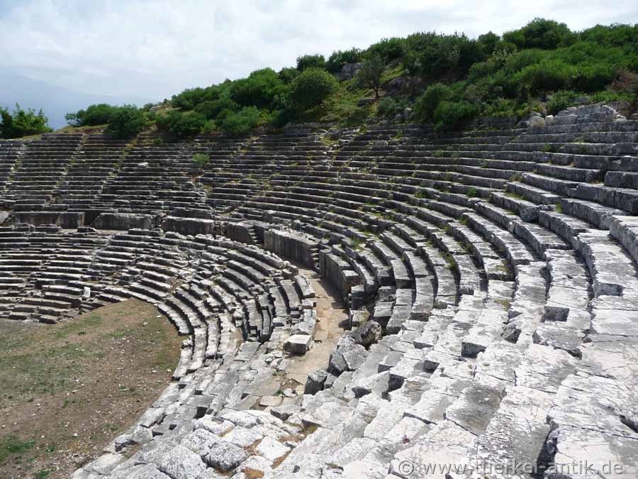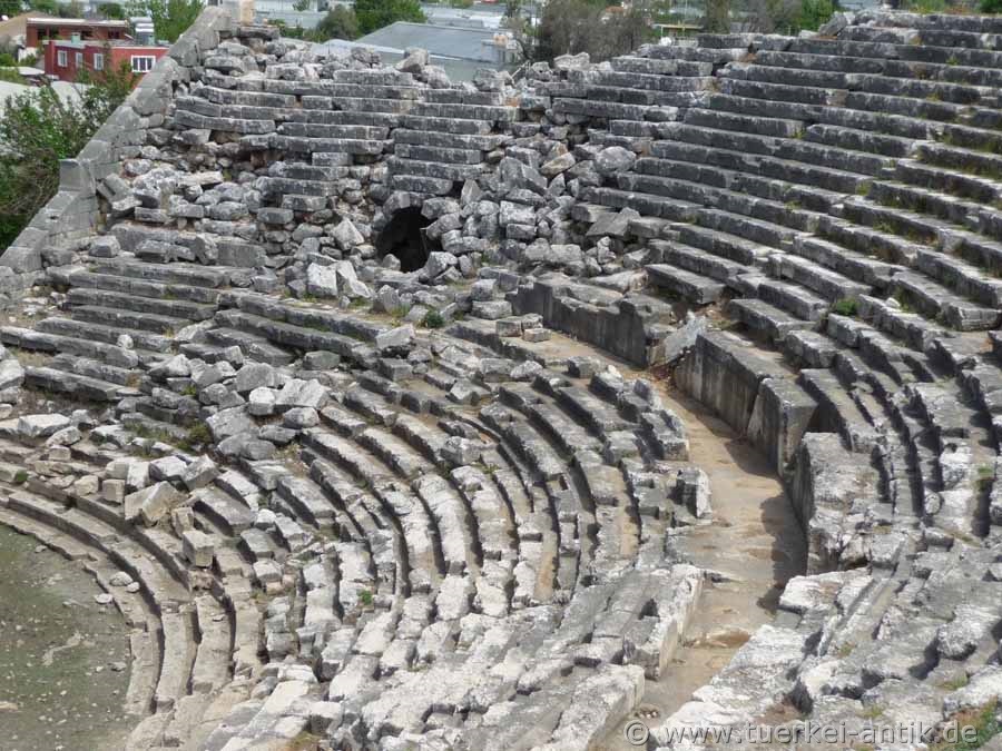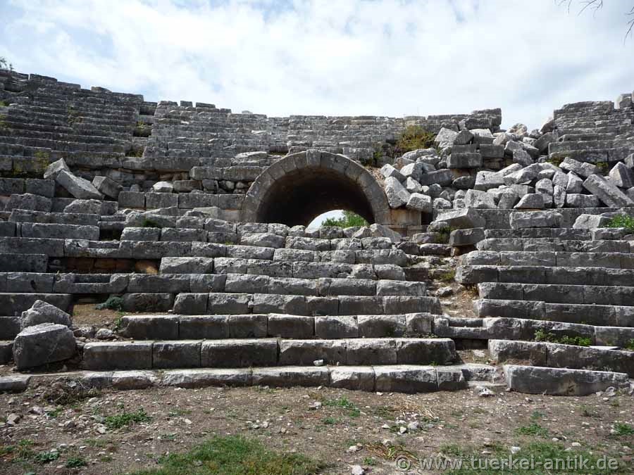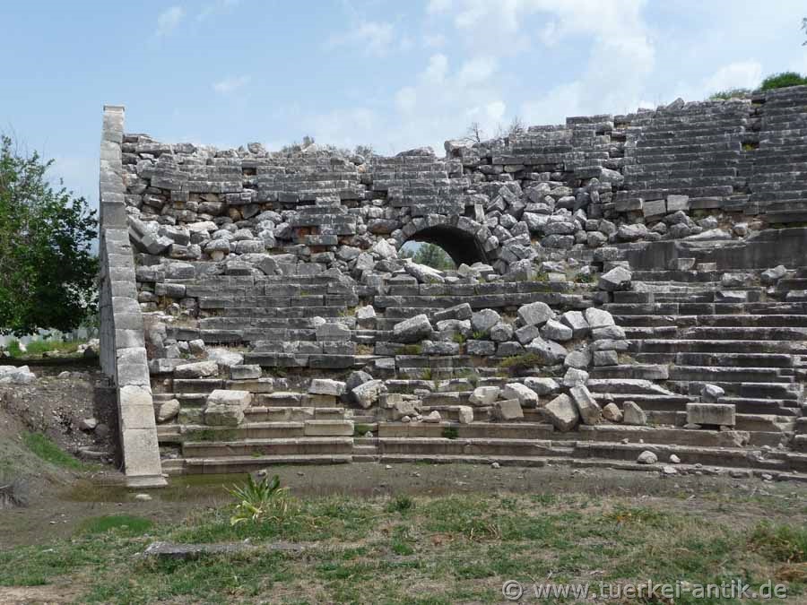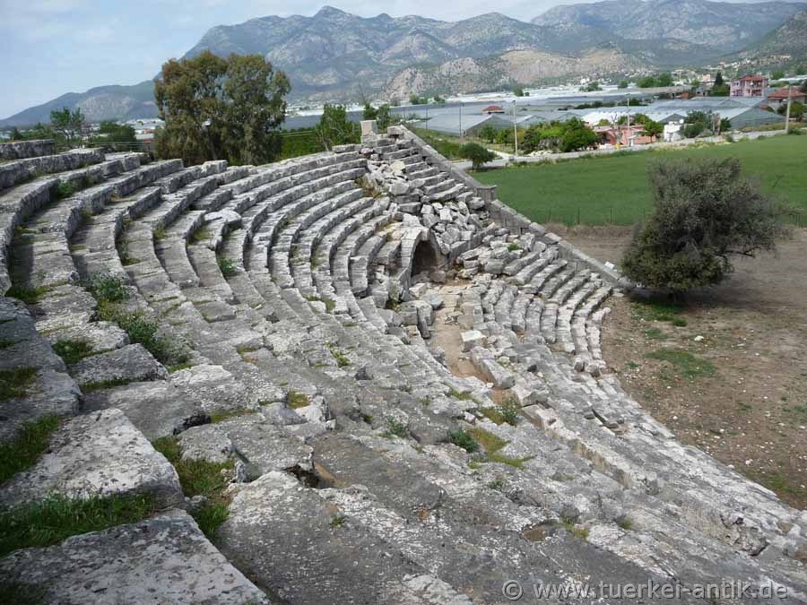 Das hellenistische Theater des Heiligtums Letoon wurde um 100 v. Chr. erbaut und bis in die römische Kaiserzeit für Theateraufführungen, aber auch als Versammlungsort und Wettkampfort der lykischen Städte genutzt. Das Heiligtum war der Göttin Leto -einer Geliebten des Zeus- geweiht, die seine Söhne Apollon und Artemis gebar. Das Theater lehnt an einen natürlichen Hügel. Der zentrale Teil der cavea wurde in den Felsen des Hügels getrieben. Die seitlichen Flügel mussten mit Mauerwerk aufgebaut werden. Es ist durch zwei gewölbte Zugänge mit gewaltigen Eingangstoren zu betreten. Beide führen auf einen Umgang (diazoma), der die cavea in 2 Ränge teilt. Das Bühnengebäude ist vollständig abgetragen |