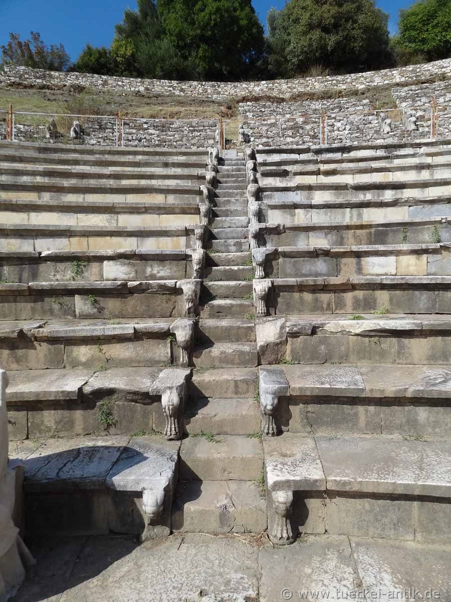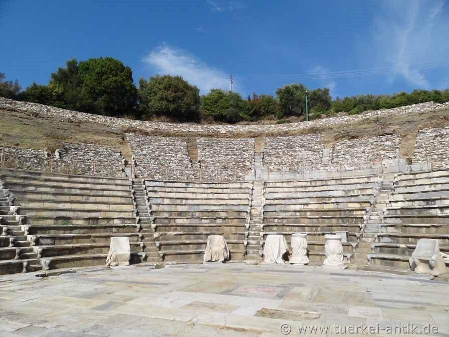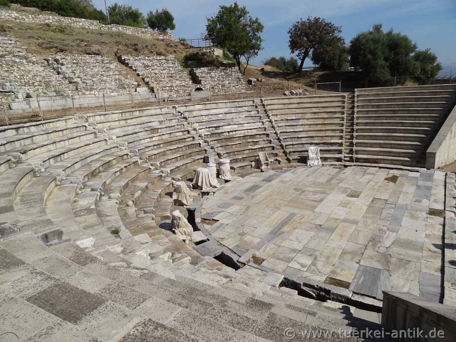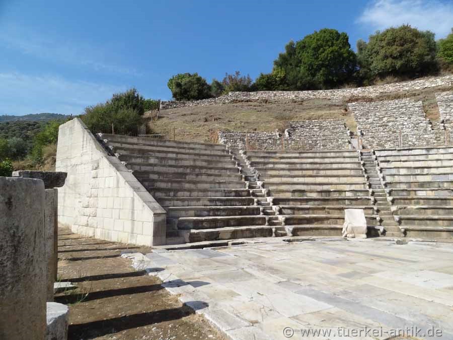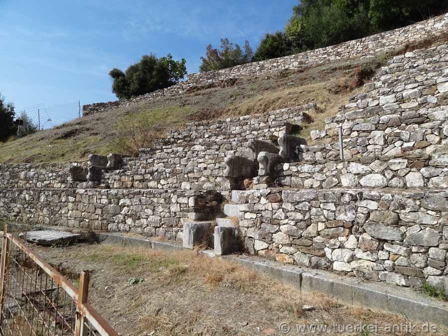 Das hellenistische Theater aus dem 3 Jh. v. Chr. wurde in einer natürliche Senke eines Berghanges errichtet. Das anfangs vermutlich hölzerne Bühnenhaus wurde etwa im 1. Jh. v. Chr. durch das heute noch erkennbare Gebäude ersetzt. Erhalten ist der untere Rang, sowie die beiden leider unsachgemäß unter Zuhilfenahme von Beton restaurierten Analemmamauern. Die Sitzsteine der beiden oberen Ränge wurden in spätbyzantinischer Zeit beim Bau der Befestigungsmauern verwendet. |