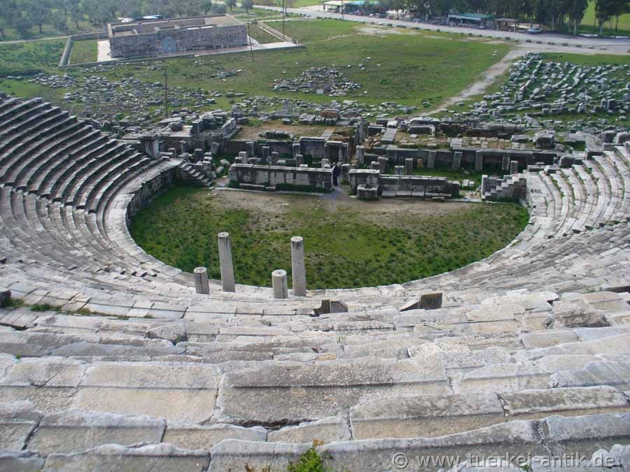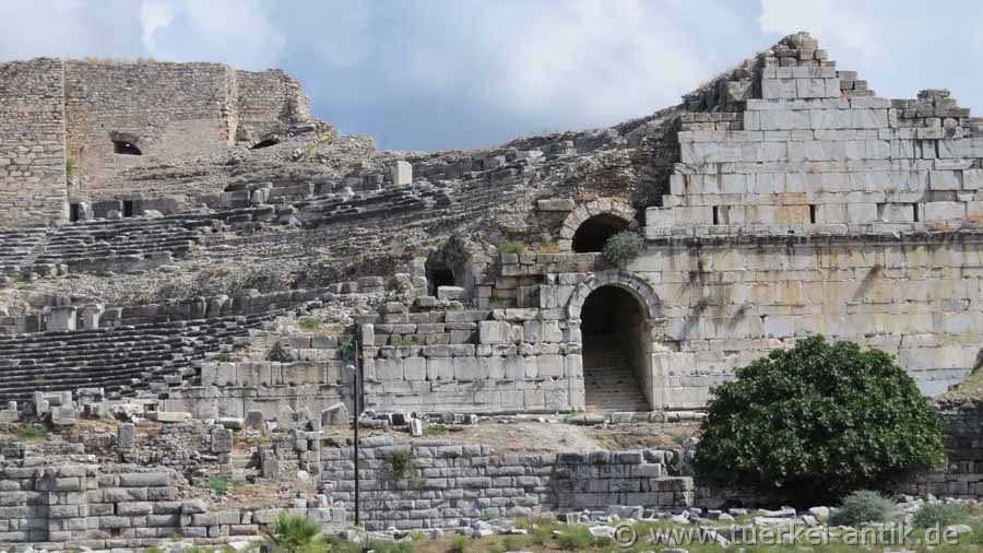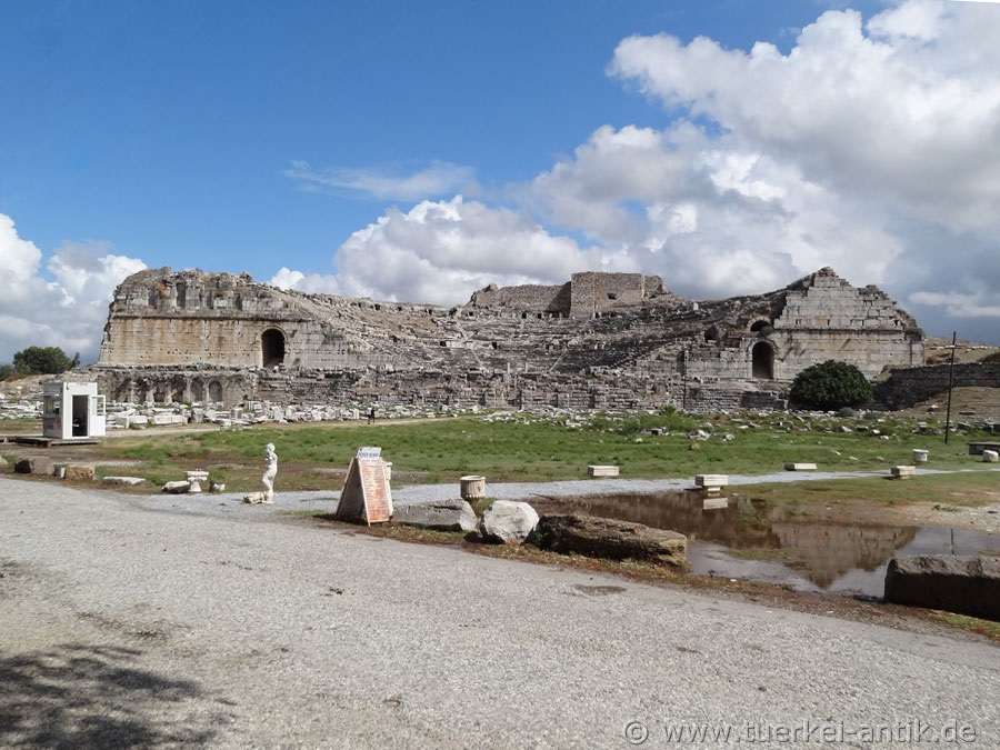 Das römische Theater von Milet wurde unter dem römischen Kaiser Trajan (98 -117 n.Chr.) über einem viel älteren hellenistischen Theater erbaut. Während das überbaute Theater 5.300 Plätze aufwies, wurde die römische Überbauung für ca. 15.000 Zuschauer konzipiert. Die orchestra war von Anfang an auch für Gladiatoren- und Tierkämpfe ausgelegt. Der in vielerlei Hinsicht ungünstige Standort des Theater wurde aus praktischen Überlegungen in einer vorhanden Mulde der natürlichen Bodenerhebung gewählt. Lediglich der dritte, obere Rang bekam eine Gewölbekonstruktion als Unterbau. Die Achse des Theaters liegt dadurch schräg zu den Achsen des Hippodamischen Stadtplans, nach dem sich die meisten der öffentlichen Bauten richteten.