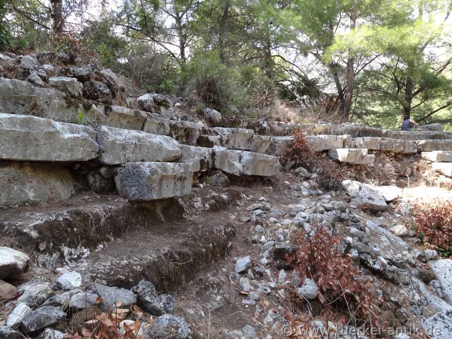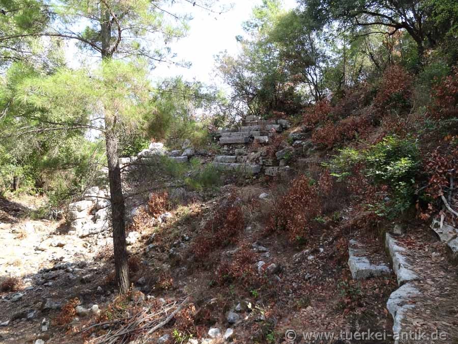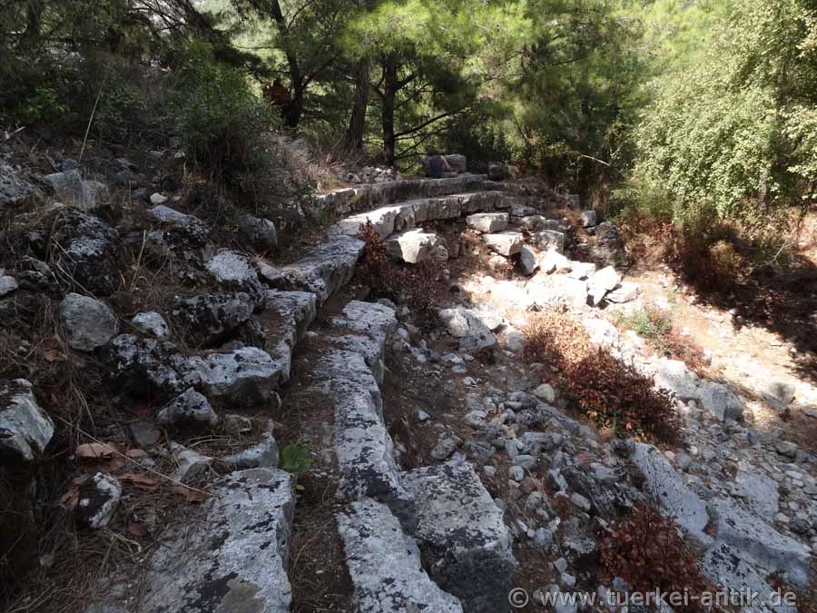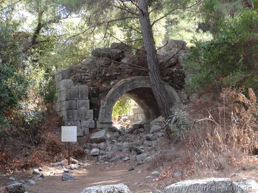 Lykischen Bundes. In den Jahren 77/78 v. Chr. eroberten die Römer die Stadt und setzten dem Treiben der Piraten ein Ende. Den Wohlstand, den die Stadt während ihrer Mitgliedschaft im Lykischen Bund erlebt hatte, erreichte sie auch in der römischen Kaiserzeit nicht mehr, obwohl noch einmal ein Aufschwung zu verzeichnen ist. Berühmt war Olympos durch die nahe gelegenen "ewigen Feuer" der Chimaira, um die sich der Kult für Hephaistos, dem griechischen Gott des Feuers und der Schmiede, rankte. Im 3. Jahrhundert n. Chr. wird Olympos noch einmal als Bischofssitz erwähnt – im 15. Jahrhundert verließen jedoch die letzten Einwohner endgültig die Stadt. Lange Zeit war Olympos völlig vergessen. Die Stadt war durch einen Bachlauf in zwei Hälften geteilt. Die Reste einer Brücke sind noch auszumachen. Leider sind die noch bestehenden Bauten, wie z.B. ein kleines römisches Theater, die Reste eines Tempels aus dem 2. Jh. v. Chr. sowie eine Basilika aus byzantinischer Zeit stark verfallen und weitgehend überwuchert. Unübersehbar ist die Nekropole mit zahlreichen Gräbern, die jedoch nicht alle lykischen Ursprungs sind.