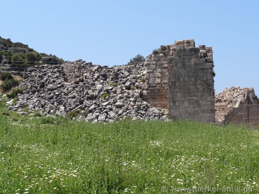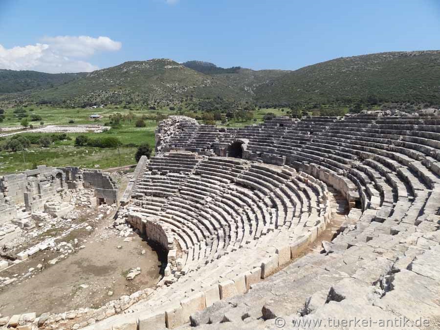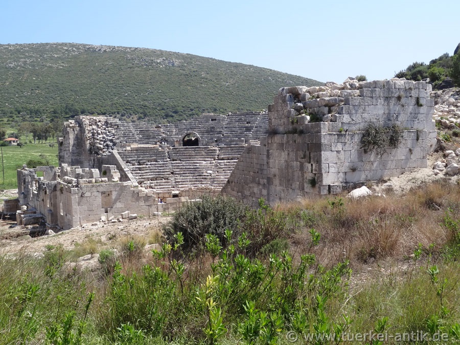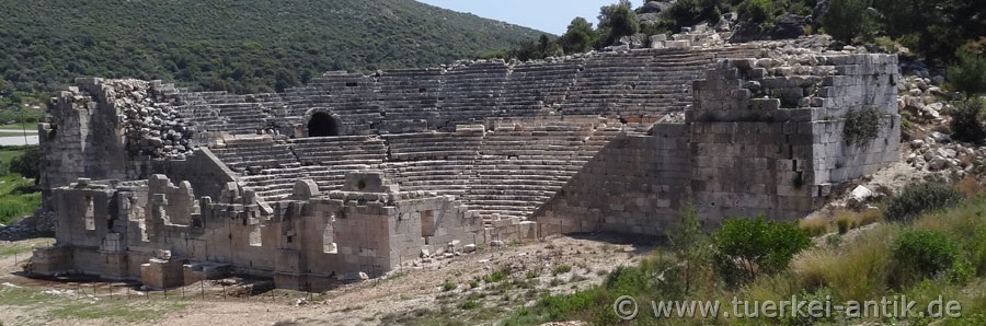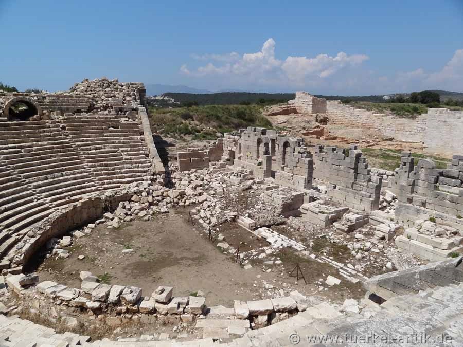 Das griechische Theater von Patara wurde erst in den Jahren 2002 bis 2004 gänzlich vom Sand befreit. Unter dem römischen Kaiser Hadrian (117 - 138 n. Chr.) wurde das Bühnenhaus errichtet, die cavea nach oben hin erweitert und mit einem Sonnensegel versehen. Überreste eines Fundamentes weisen darauf hin, dass im Zuge dieser Arbeiten auf den oberen Zuschauerrängen ein kleiner Theatertempel errichtet wurde. Lt. der Inschrift auf seinem Mausoleum hat der reiche Opramoas aus Rhodiapolis nach dem verheerenden Erdbeben im Jahr 141 n. Chr. auch für den Wiederaufbau des Theaters in Patara eine nicht unerhebliche Summe gespendet. Die Fachwelt scheint sich aber uneinig, ob das Erdbeben 141 n. Chr. auch Patara in Mitleidenschaft gezogen hat. Opramoas könnte auch ohne Erdbeben als Finanzier gewirkt haben. Im 3. Jh. n. Chr. wurde die Orchestramauer errichtet und die orchestra zur Arena umgebaut. Seit der Erweiterungsarbeiten unter Hadrian hatte das Theater ein Fassungsvermögen von ca. 15.000 Zuschauern |