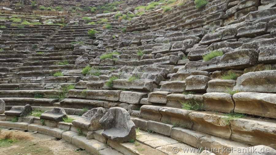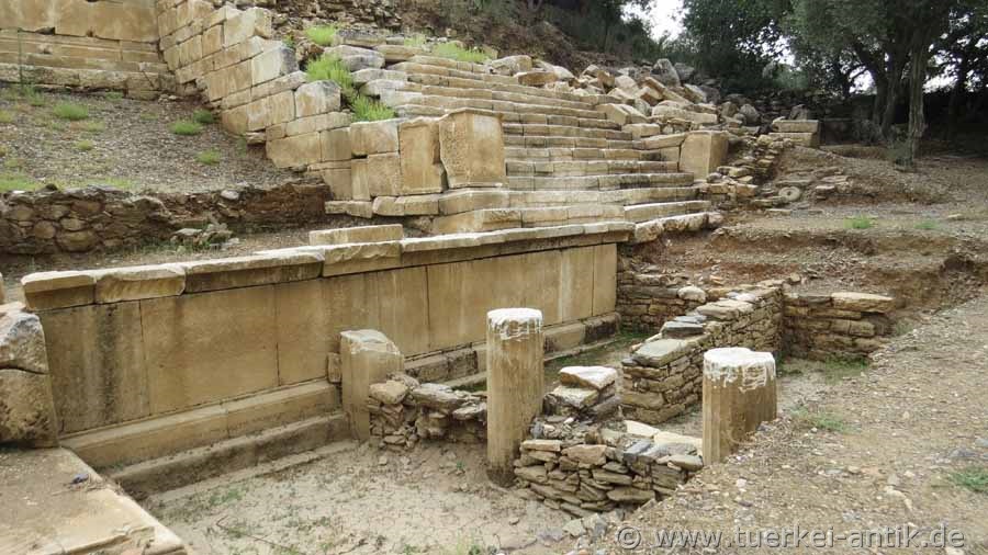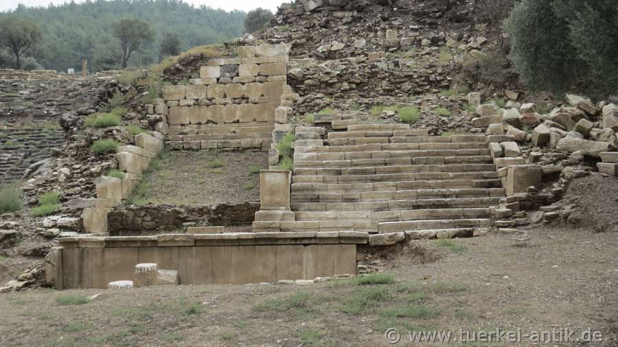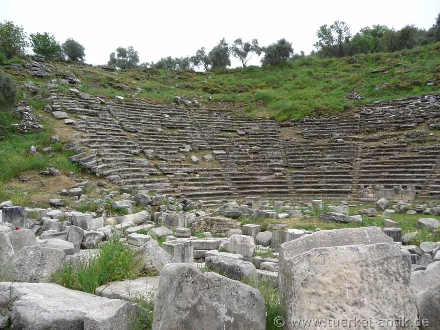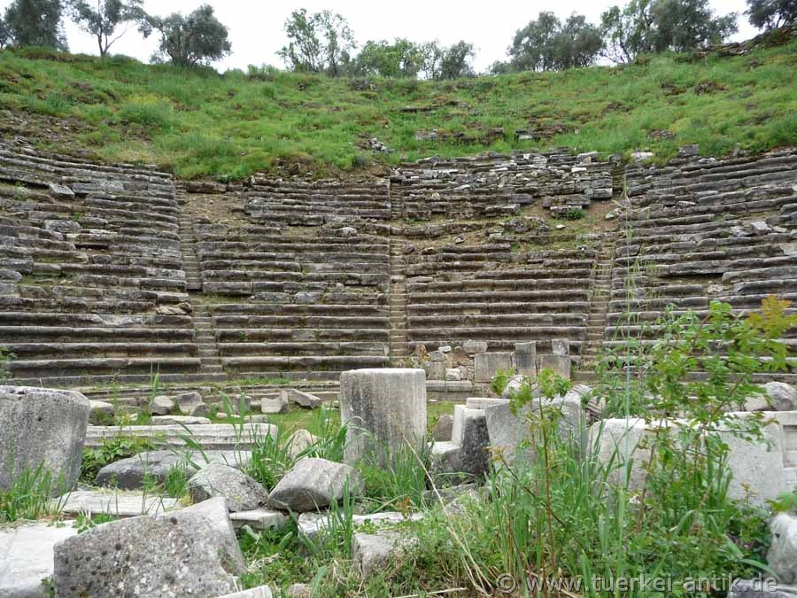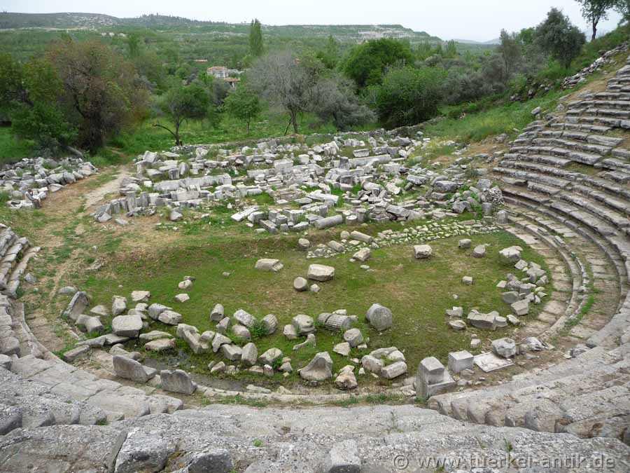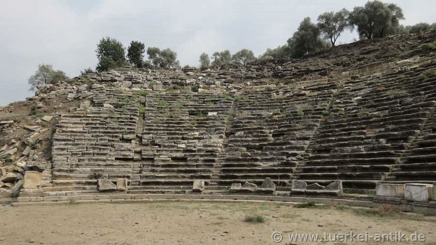 Die cavea des ursprünglich griechischen Theaters von Stratonikeia wurde in den Kadıkulesi, einen natürlichen Hang, gebaut. In römischer Zeit wurden etliche Umbauten und Erweiterungen vorgenommen. Unter Augustus (römischer Kaiser 31 v. Chr. - 14 n. Chr.), oder unmittelbar danach, wurde das alte Bühnenhaus durch ein neues, dreistöckiges Gebäude ersetzt. |