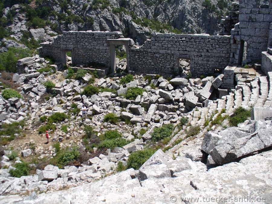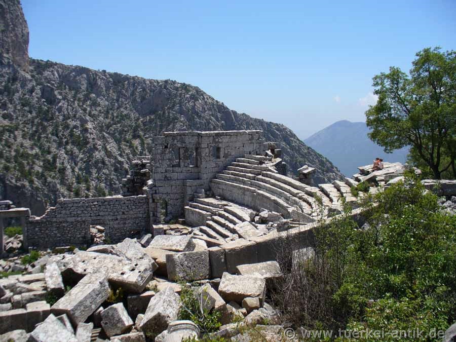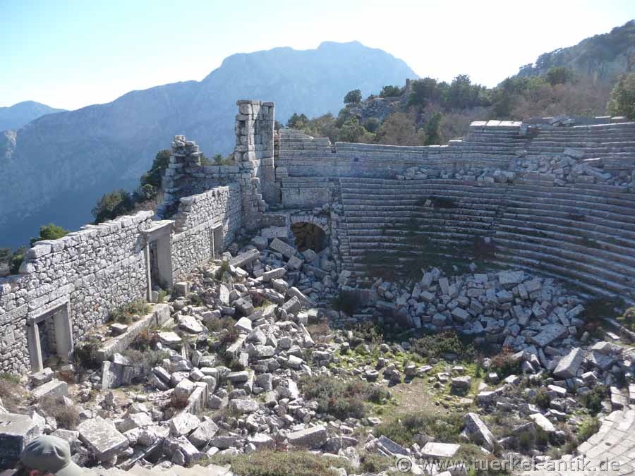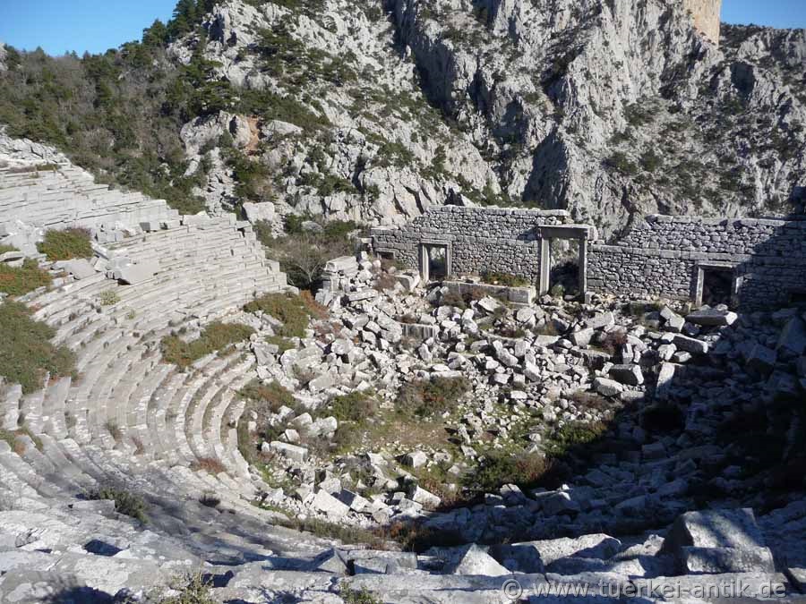 Das ursprünglich griechischen Theaters von Termessos wurde im frühen 2. Jh. v. Chr. errichtet und unter Augustus (römischer Kaiser von 31 v. Chr. bis 14 n. Chr.) umgebaut. Erst im späten 2. Jh. n. Chr. wurde das Bühnenhaus hinzugefügt, von dem noch heute ein Großteil der Bühnenfront erhalten ist. Zu einem späteren Zeitpunkt wurde oberhalb der obersten Ränge ein Säulengang (porticus) errichtet, der allerdings die nachfolgenden Erdbeben nicht überstand. |