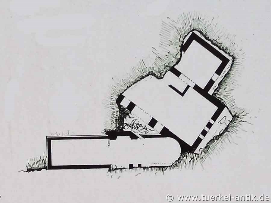 Obwohl das Zentralbad von Alabanda noch nicht ausgegraben ist, kann man den Bauplan erkennen. Es besaß wie alle hellenistischen und römischen Bäder ein frigidarium und ein caldarium. Die Länge des Gebäudes beträgt in Nord-Ost/Südwest-Richtung 69,0 Meter. Der 43,1 m lange und 8,1 m breite Apsidenraum diente sehr wahrscheinlich als apoditerium. Der 17,0 m lange und 21,9 m breite zentrale Raum war über Bogentüren mit den angrenzenden Räumen verbunden. Der große gewölbte Eingang war 5,8 m breit und vermutlich 2,5 m hoch. Der kleinere der Innenräume war 8,9 m x 11,2 m groß und besaß einen gewölbten Durchgang zum zentralen Raum. Über das Alter dieses Bauwerkes war nichts zu erfahren. Zukünftige Ausgrabungen und Forschungen werden sicher auch darüber Informationen zutage fördern. |