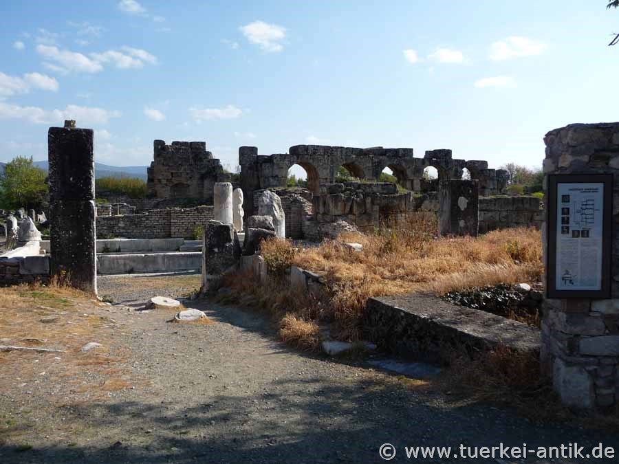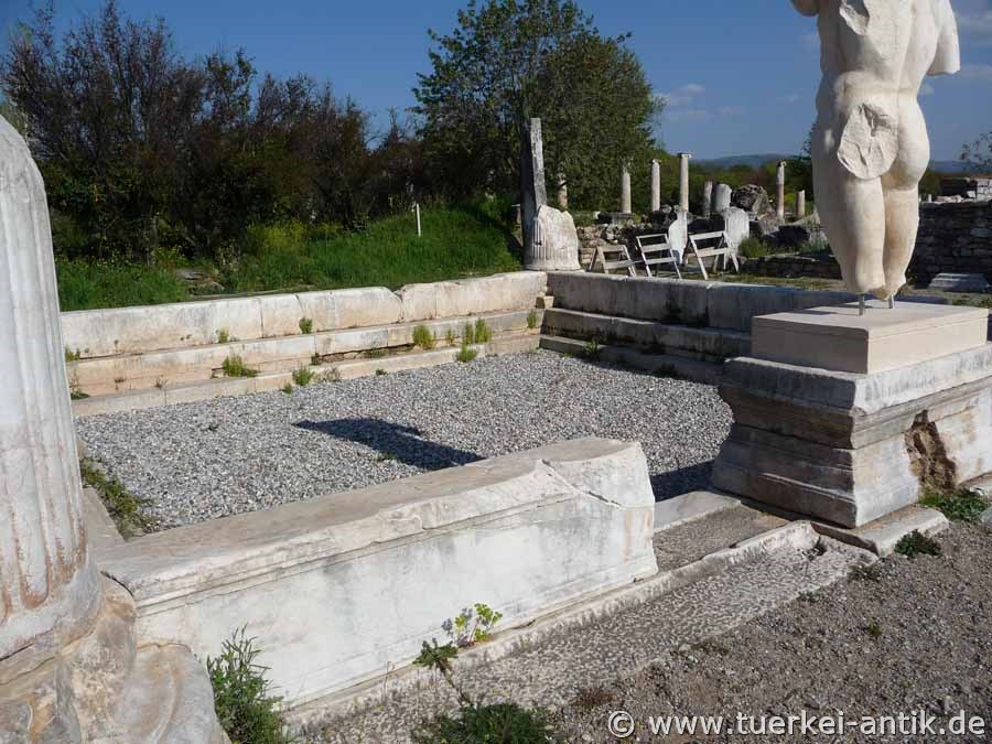 eingestürzt. Das Bad war ein wichtiges Zentrum des öffentlichen Lebens, ein Ort zum Baden, Entspannen und des Vergnügens. Es war reich mit Skulpturen geschmückt, darunter mythologische Statuen in und um den Brunnen, architektonische Skulpturen auf dem Vorplatz und Porträtstatuen in den Kolonnaden des Vorplatzes und im Portikus davor. Die bei den aktuellen Ausgrabungen gefundenen Skulpturen sind im Aphrodisias Museum ausgestellt. |