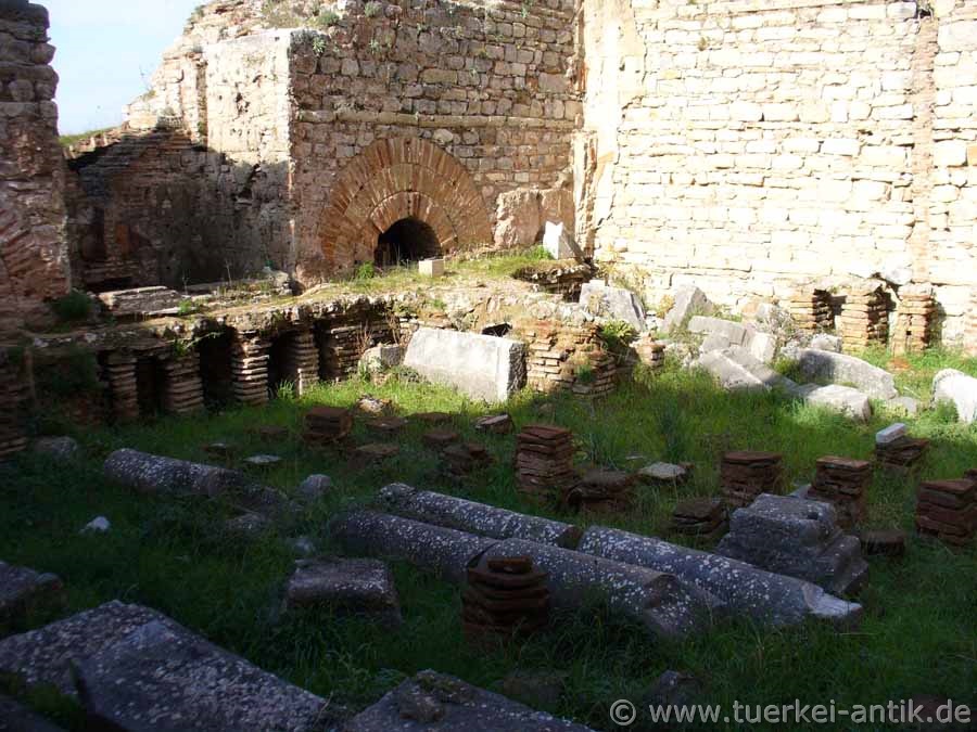 Beide Wege führten ins Apodyterium, einen L-förmigen Saal mit zehn Nischen und einer Apsis, von dem aus man vermutlich auf die Kuretenstraße blicken konnte. In einer Ecke des Raumes hat sich ein kleiner Rest des ursprünglichen Bodenbelages aus farbigem Marmor erhalten, der restliche Fußboden stammt aus der Zeit um 400. Eine schmale Tür führt vom Tepidarium ins Caldarium. Hier sind die Mauern noch in ihrer originalen Höhe erhalten, die Wandverkleidungen stammen jedoch aus unterschiedlichen Epochen. Unter dem Boden dieses Raumes befand sich der Heizraum, der die ganze Anlage mit warmem Wasser und heißer Luft versorgte. Das zugehörige Hypokaustum ist gut erhalten. |